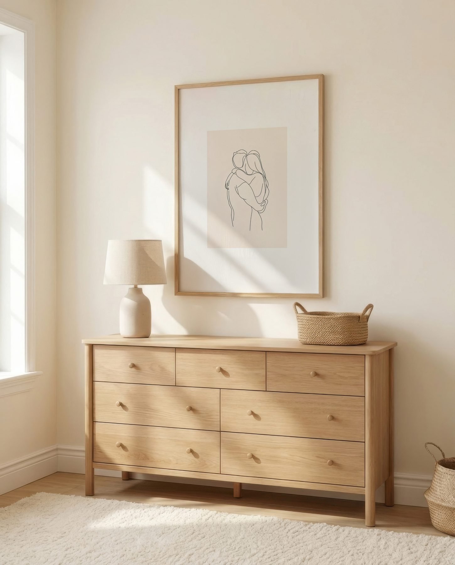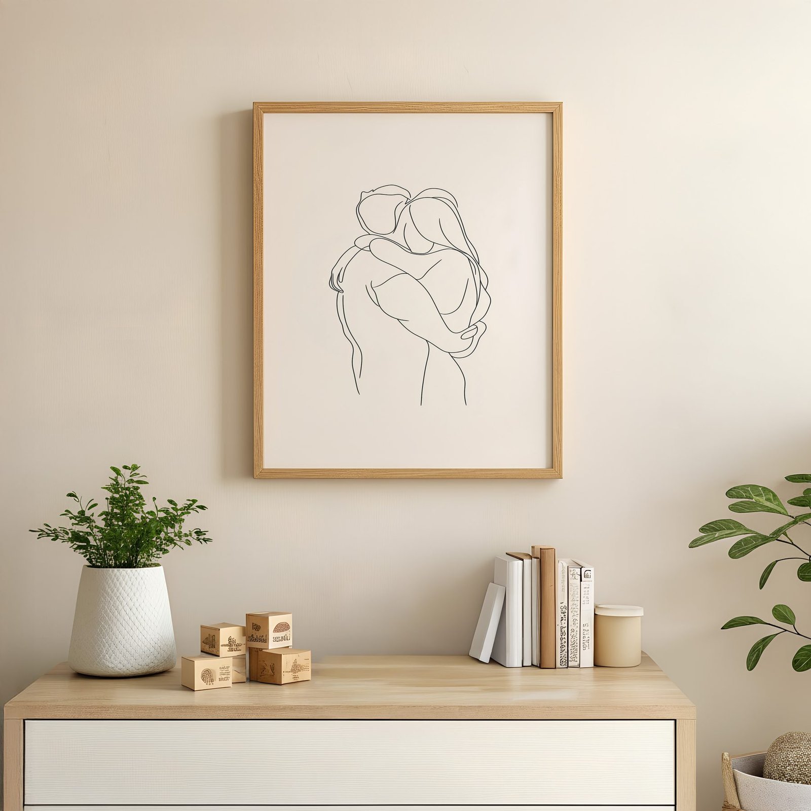 The minimalist line art approach and soft beige, warm cream, gentle peach palette give it presence in a prayer corner while still sitting naturally with wood, linen, and neutral walls.