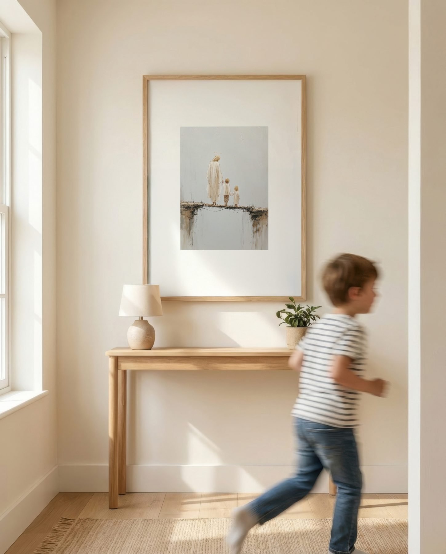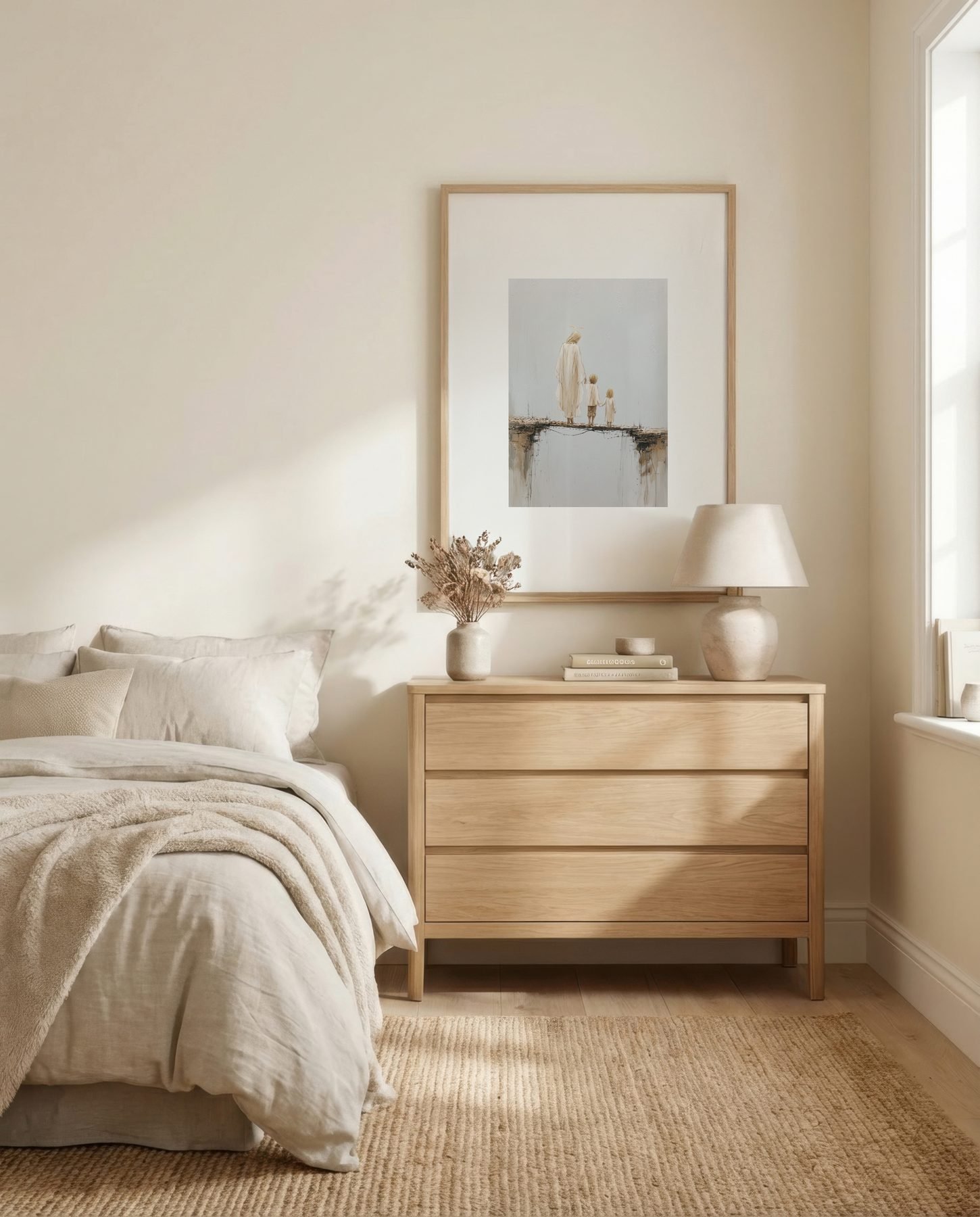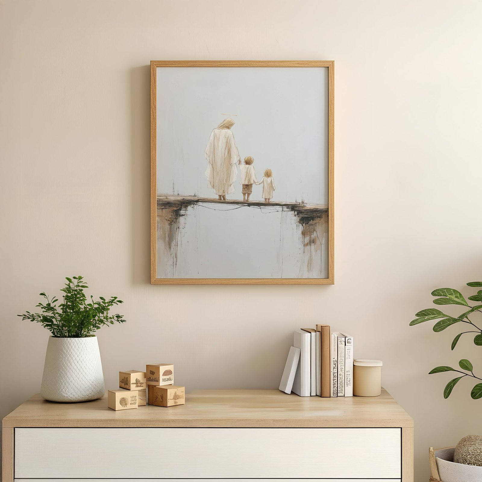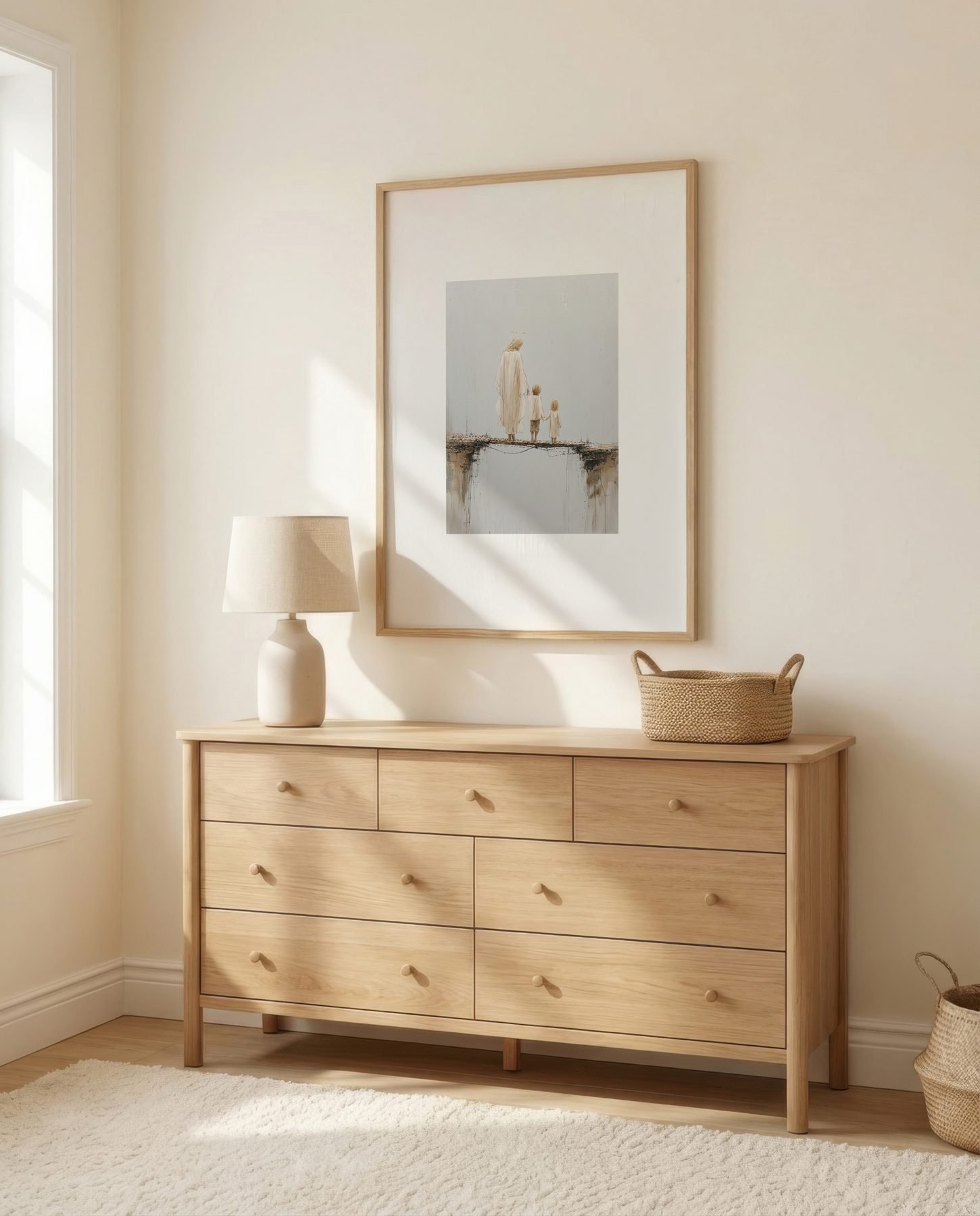 The soft watercolor illustration approach and cream, soft beige, golden brown, pale gray palette keep it gentle in a nursery, pairing naturally with wood furniture, soft bedding, and quiet neutrals.