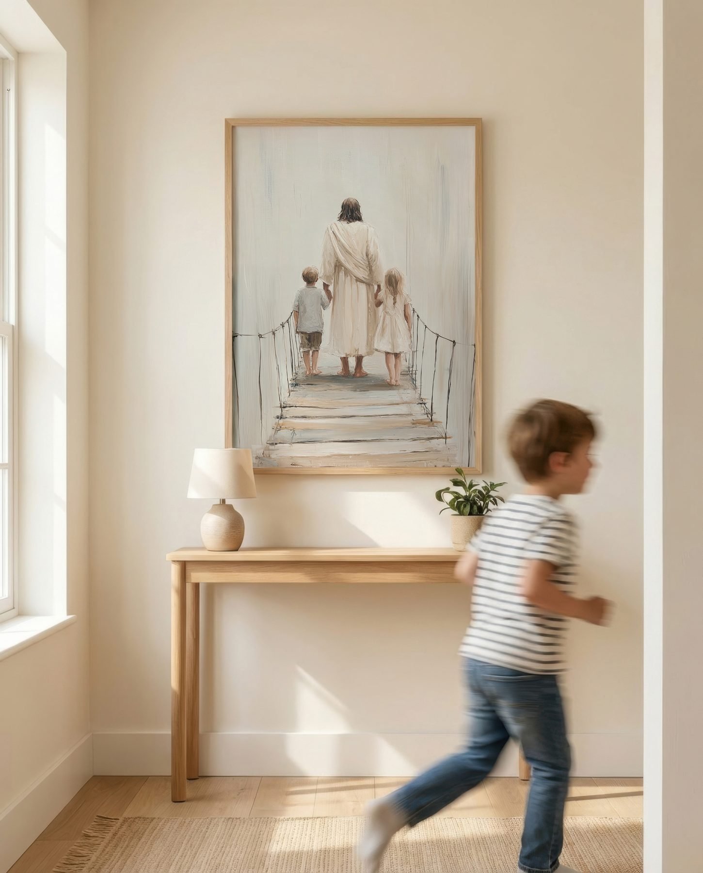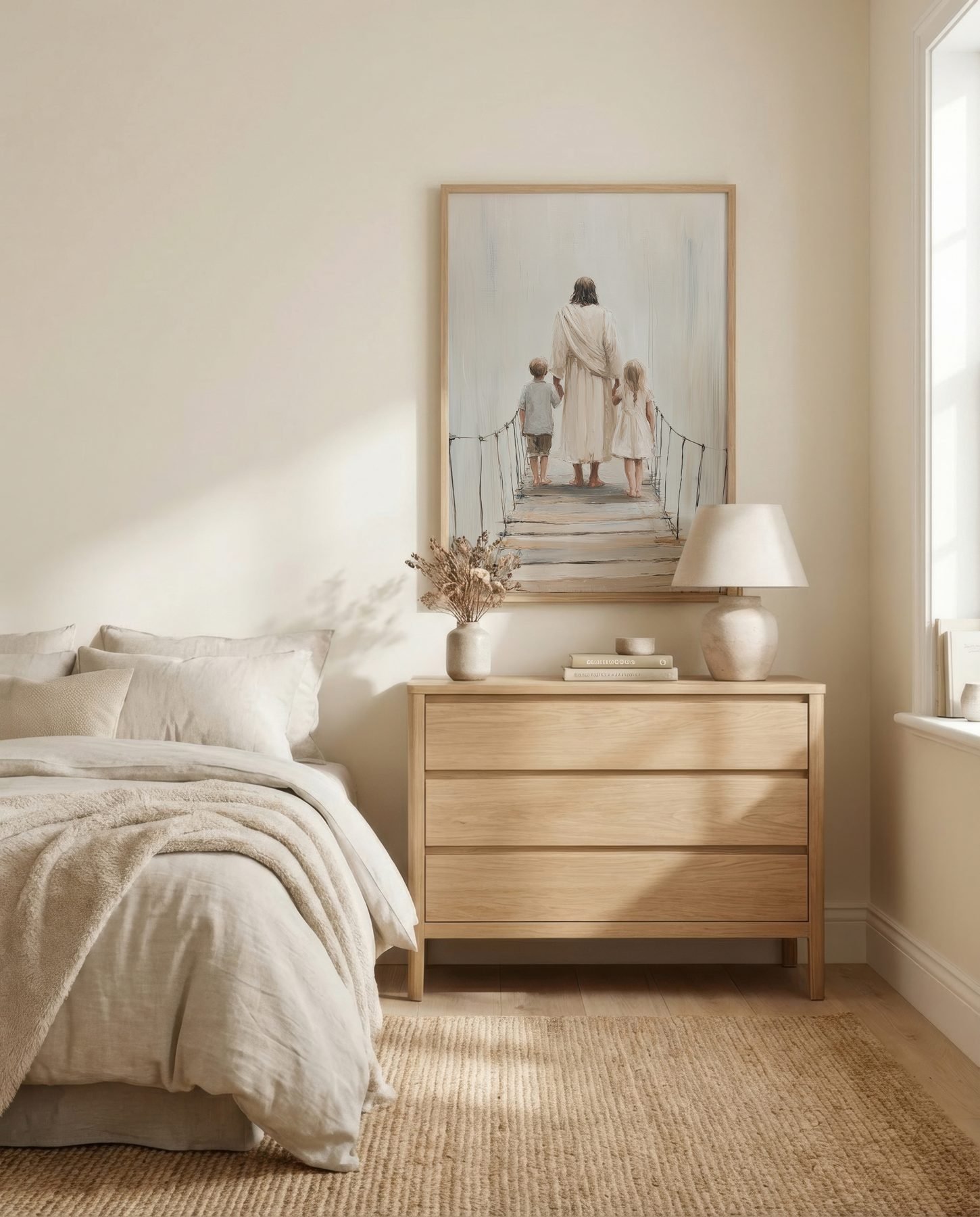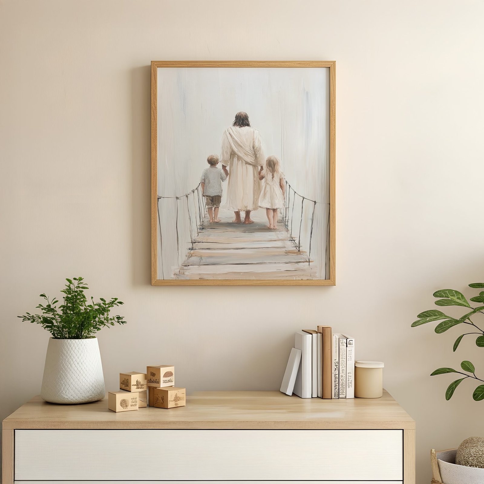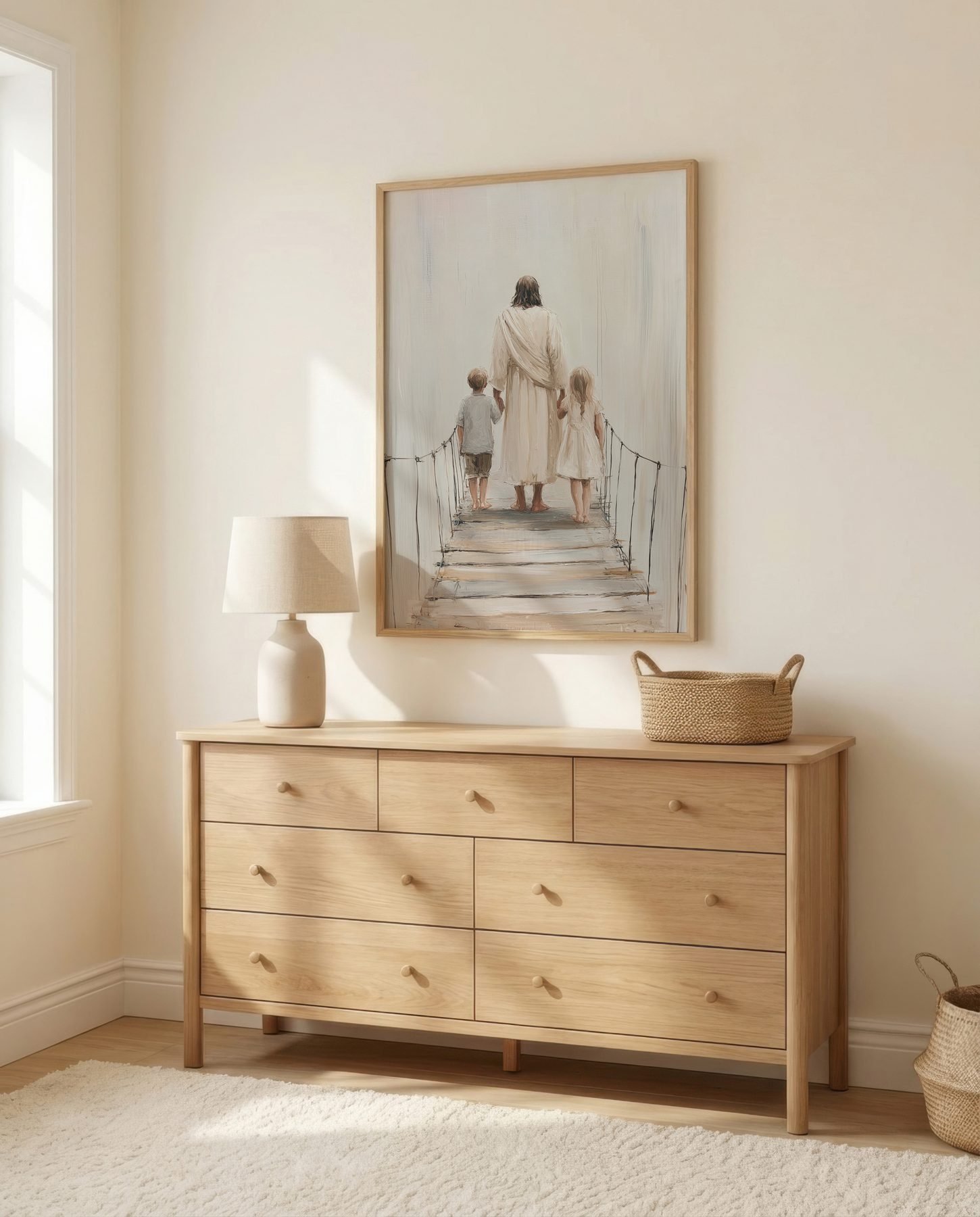 The soft watercolor illustration approach and cream, soft beige, warm white, gentle brown palette keep it gentle in a nursery, pairing naturally with wood furniture, soft bedding, and quiet neutrals.