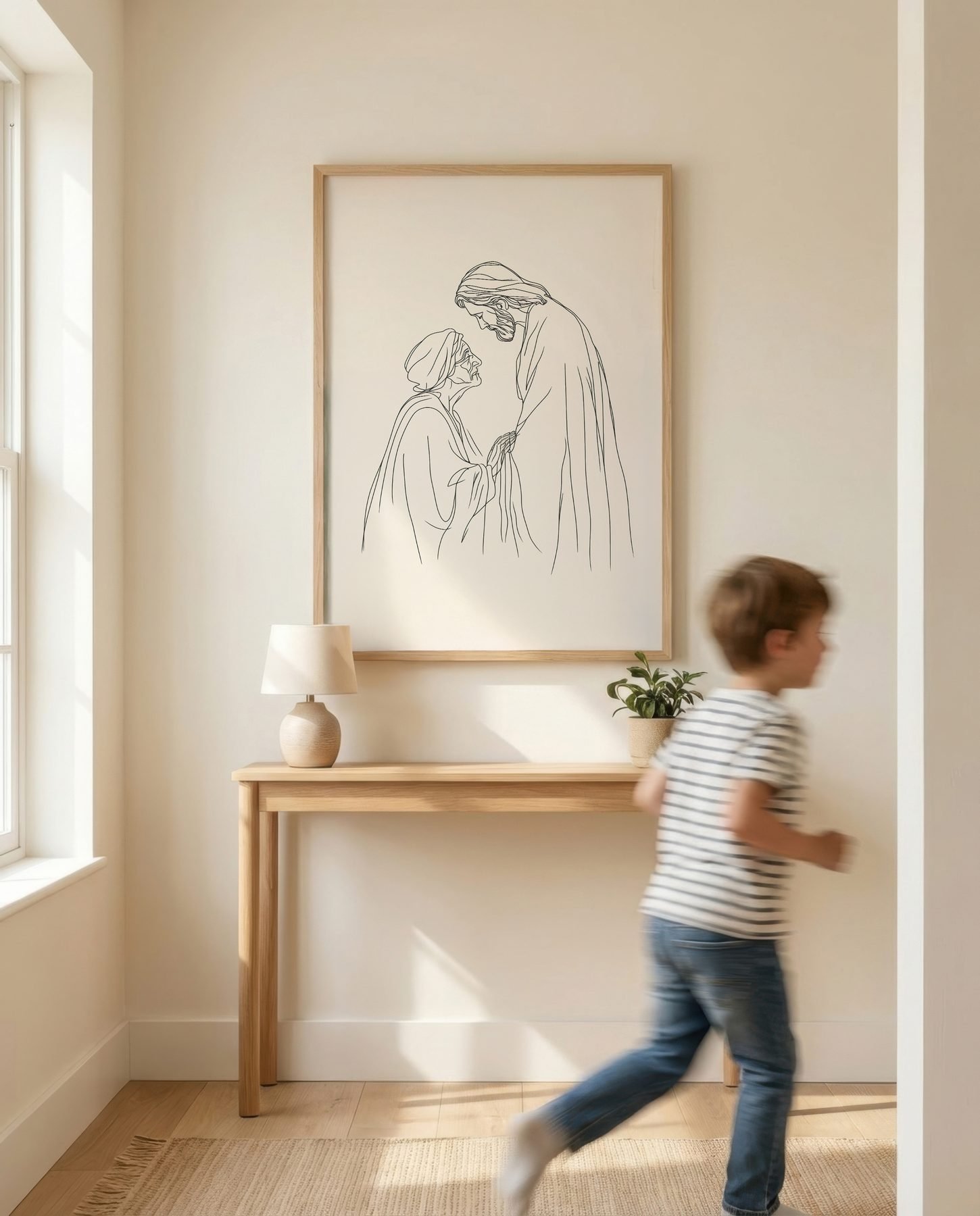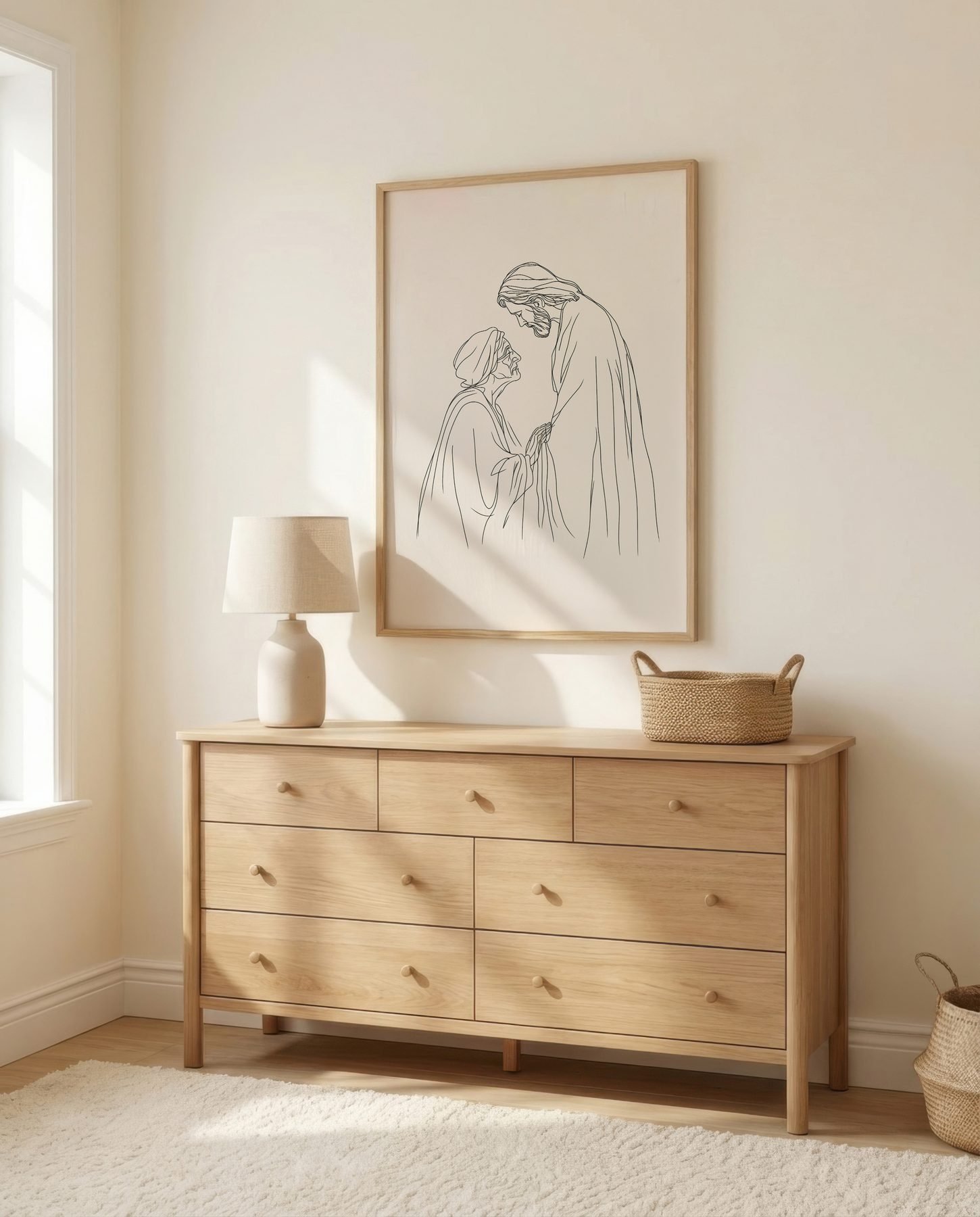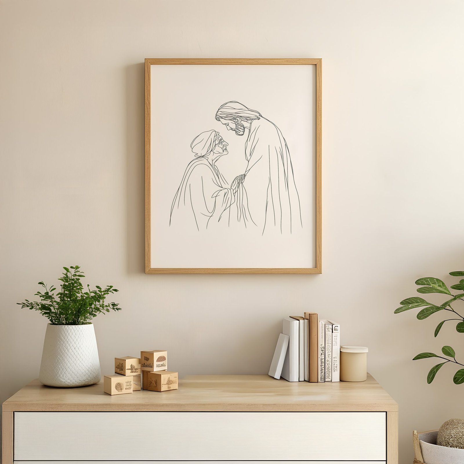 The minimalist line art approach and cream, warm beige, soft brown palette give it presence in a prayer corner while still sitting naturally with wood, linen, and neutral walls.