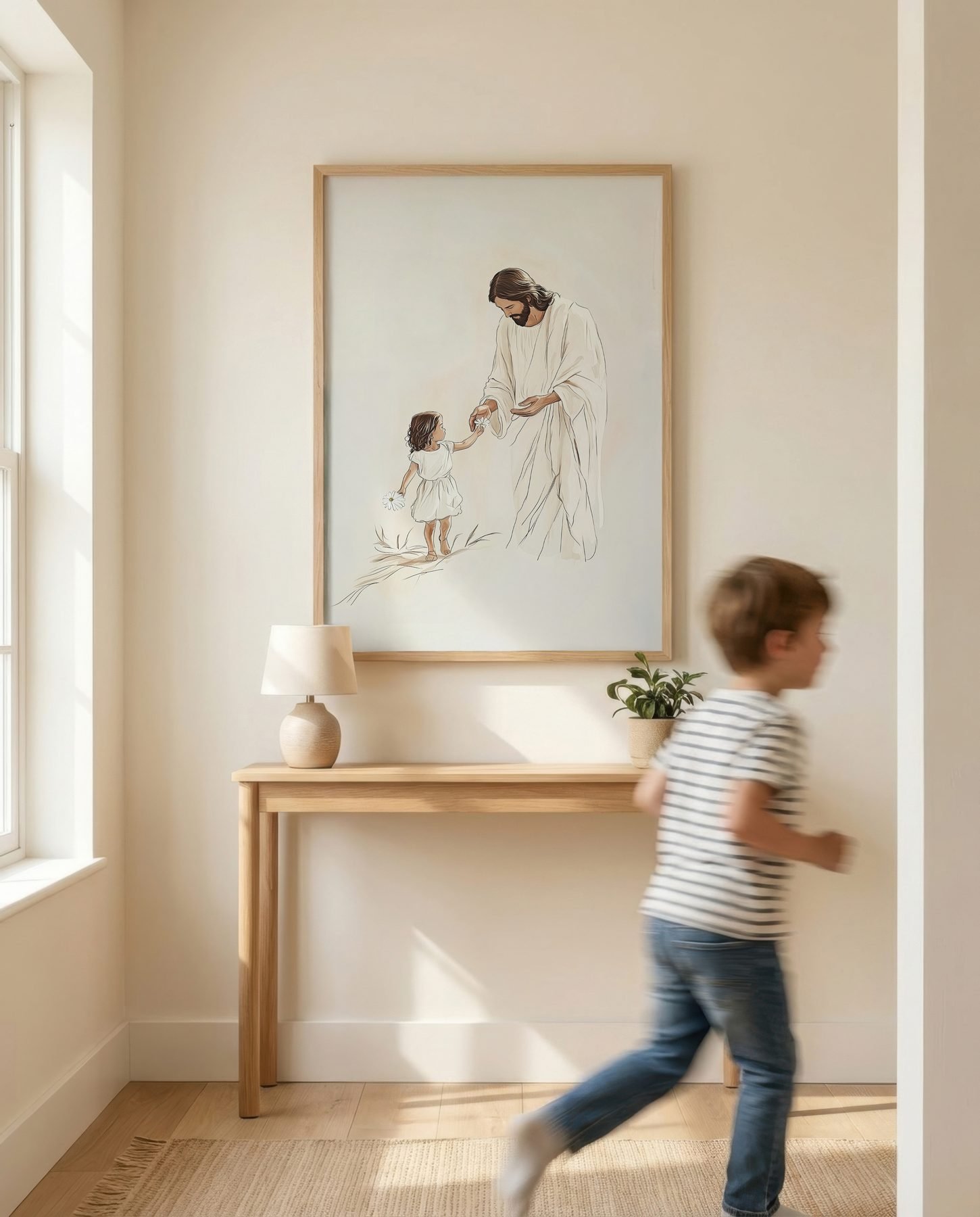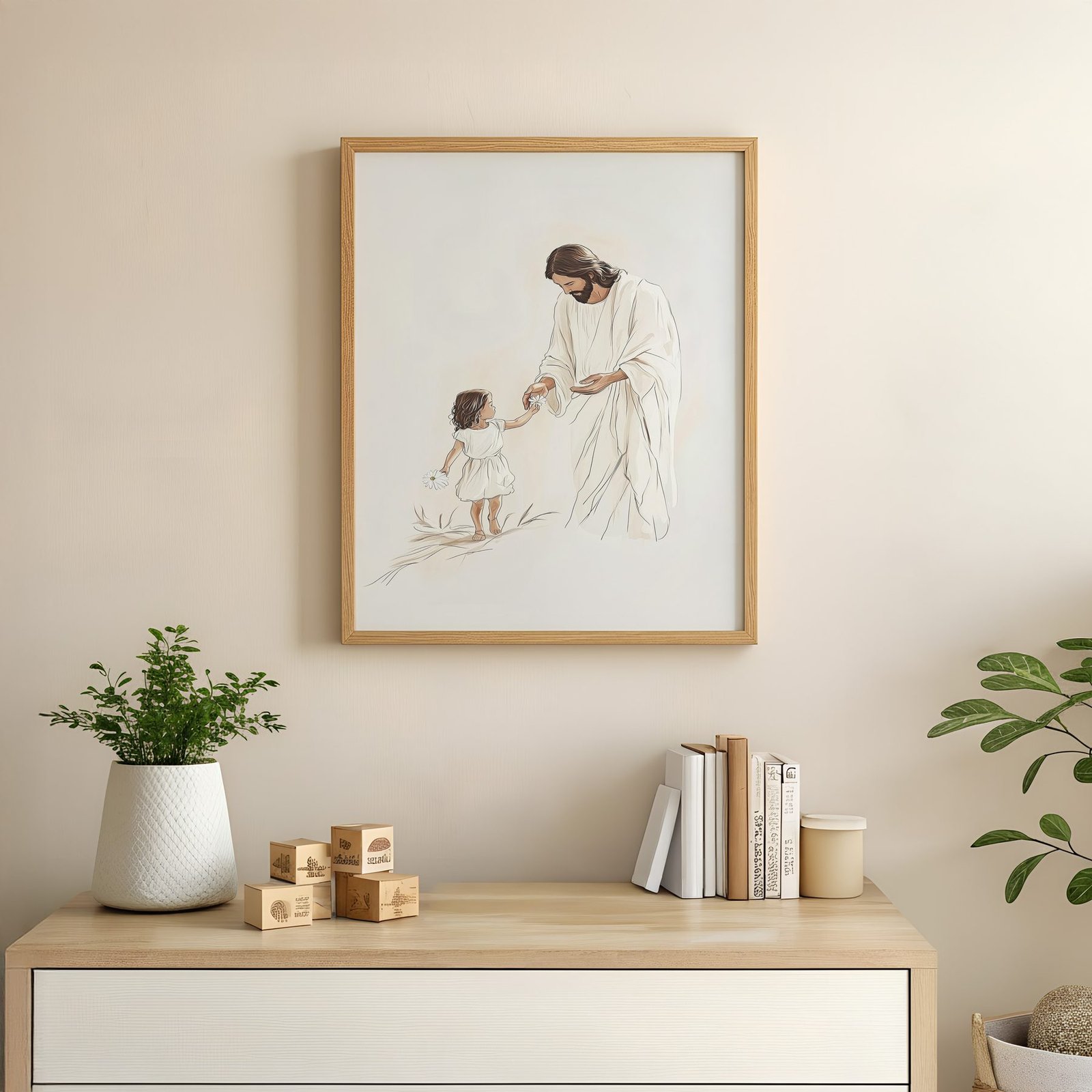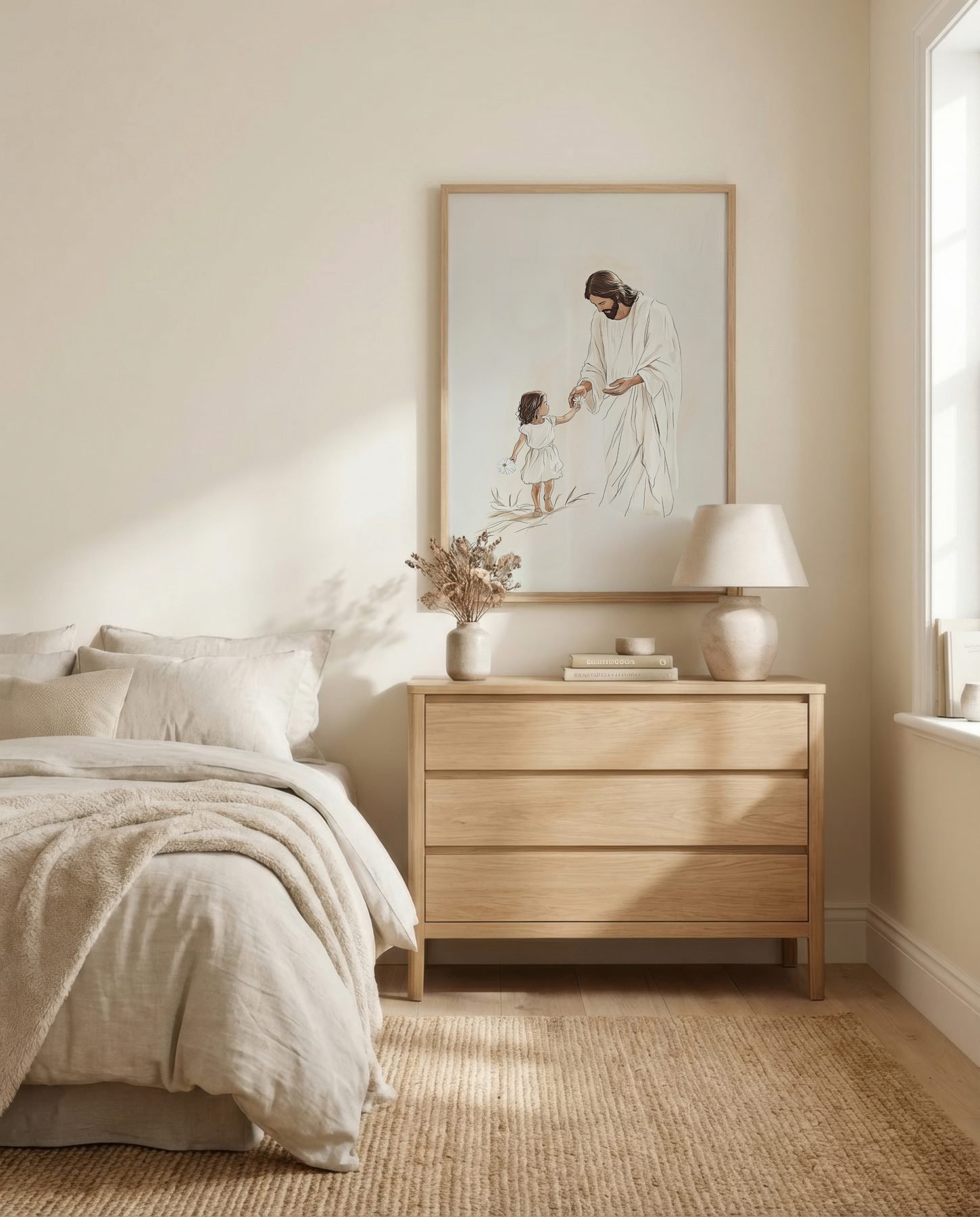 The soft painterly illustration approach and cream, soft white, warm beige, gentle brown palette keep it gentle in a nursery, pairing naturally with wood furniture, soft bedding, and quiet neutrals.