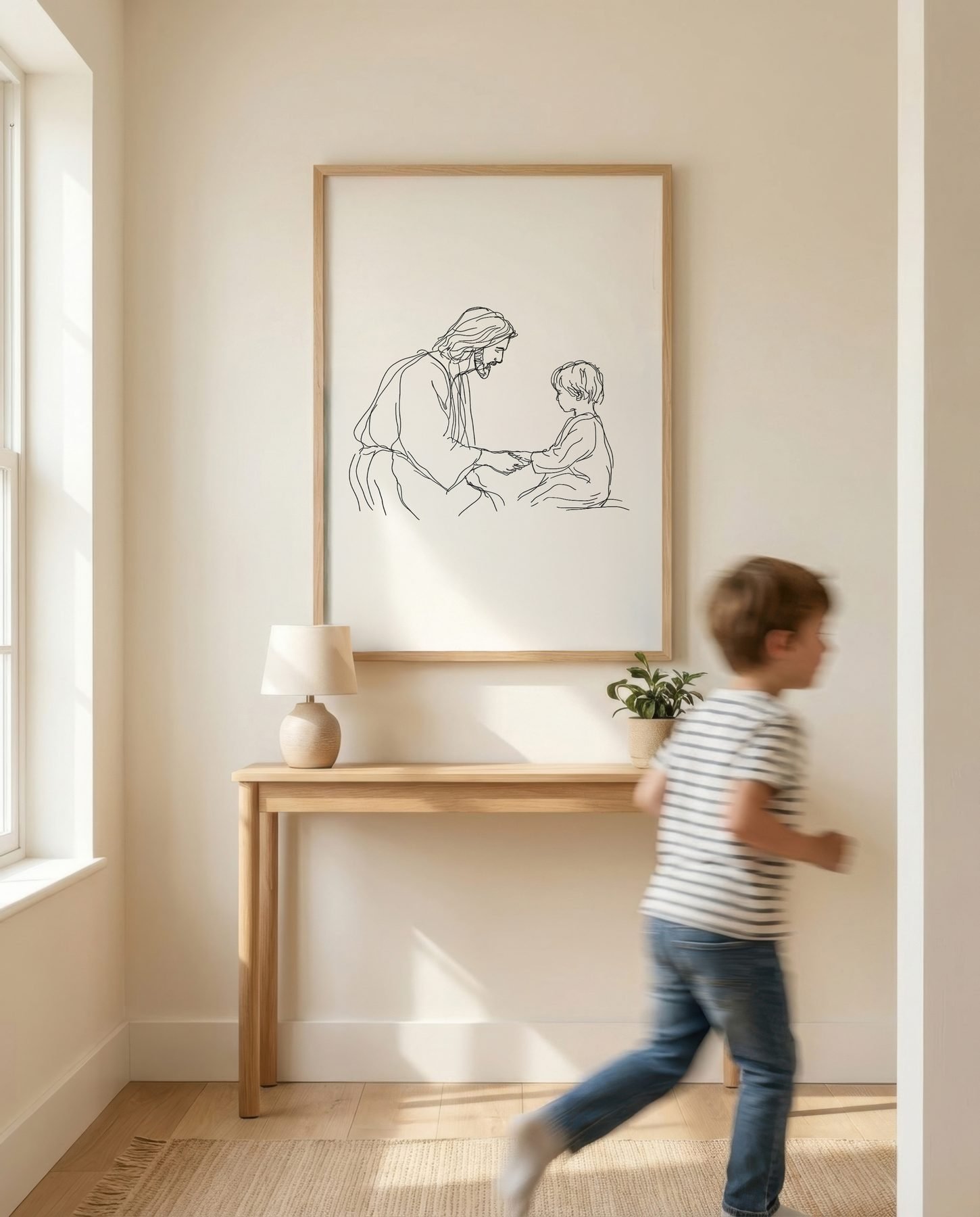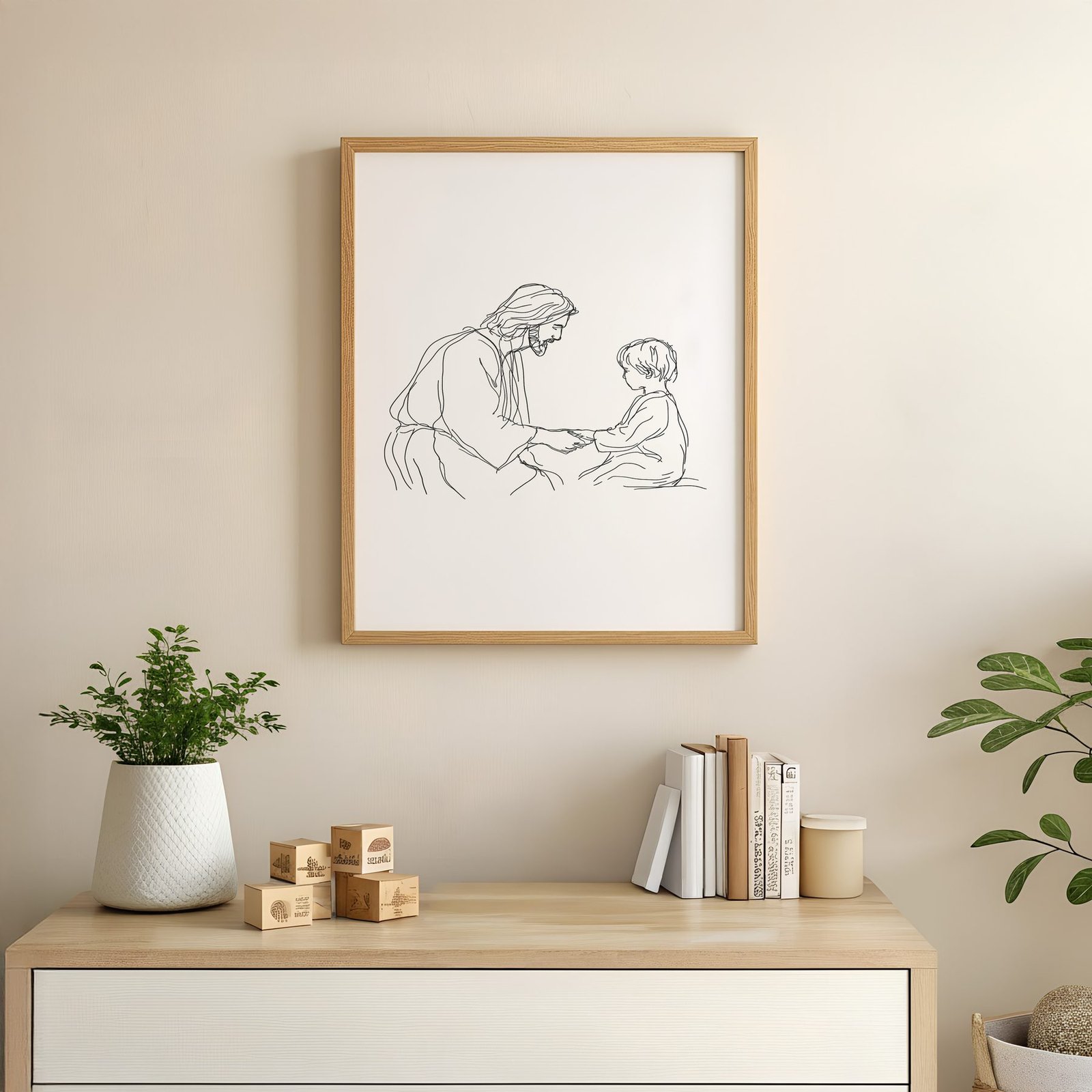 The minimalist line art approach and black, white, cream palette keep it calm in a bedroom, working easily with layered textiles, wood tones, and muted walls.