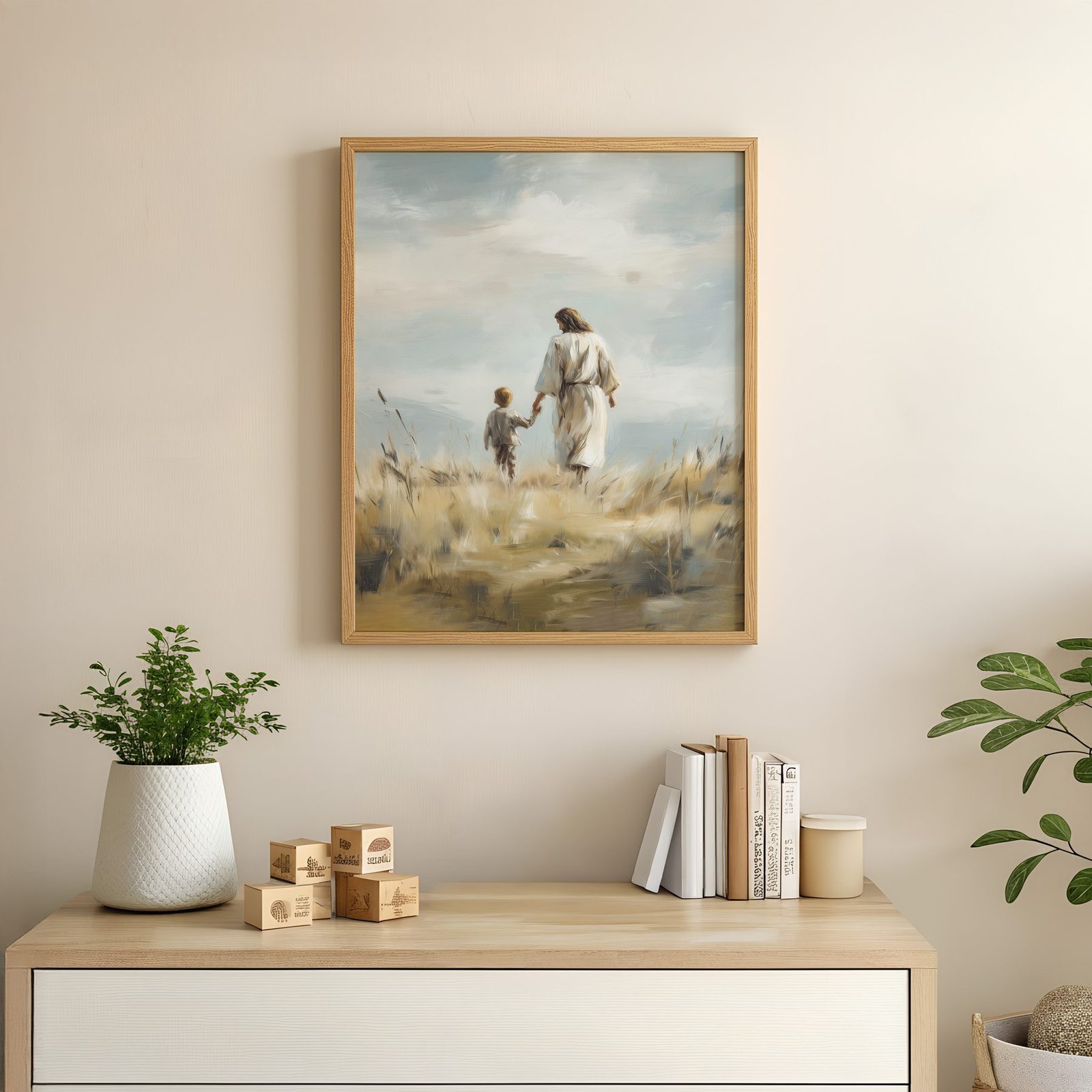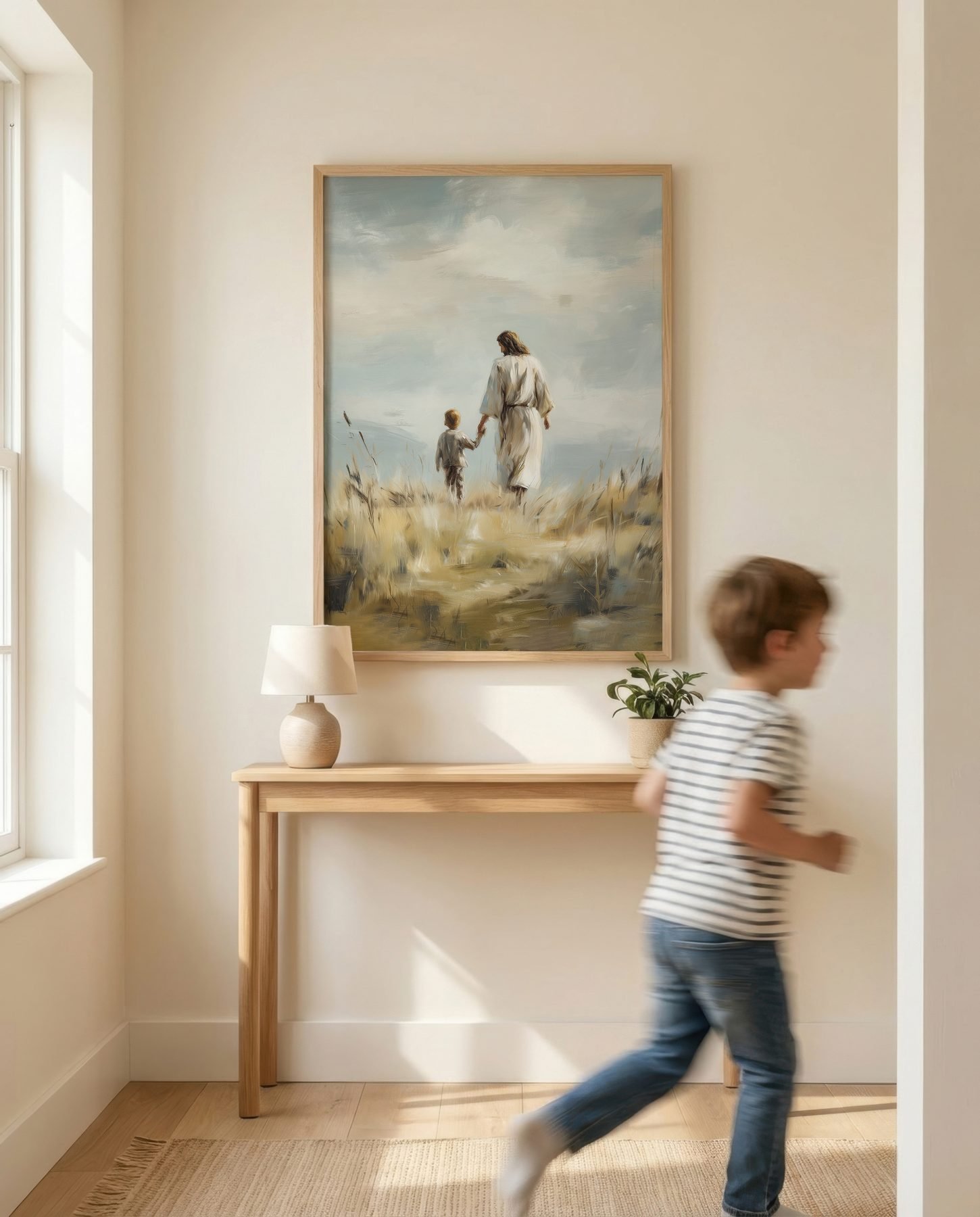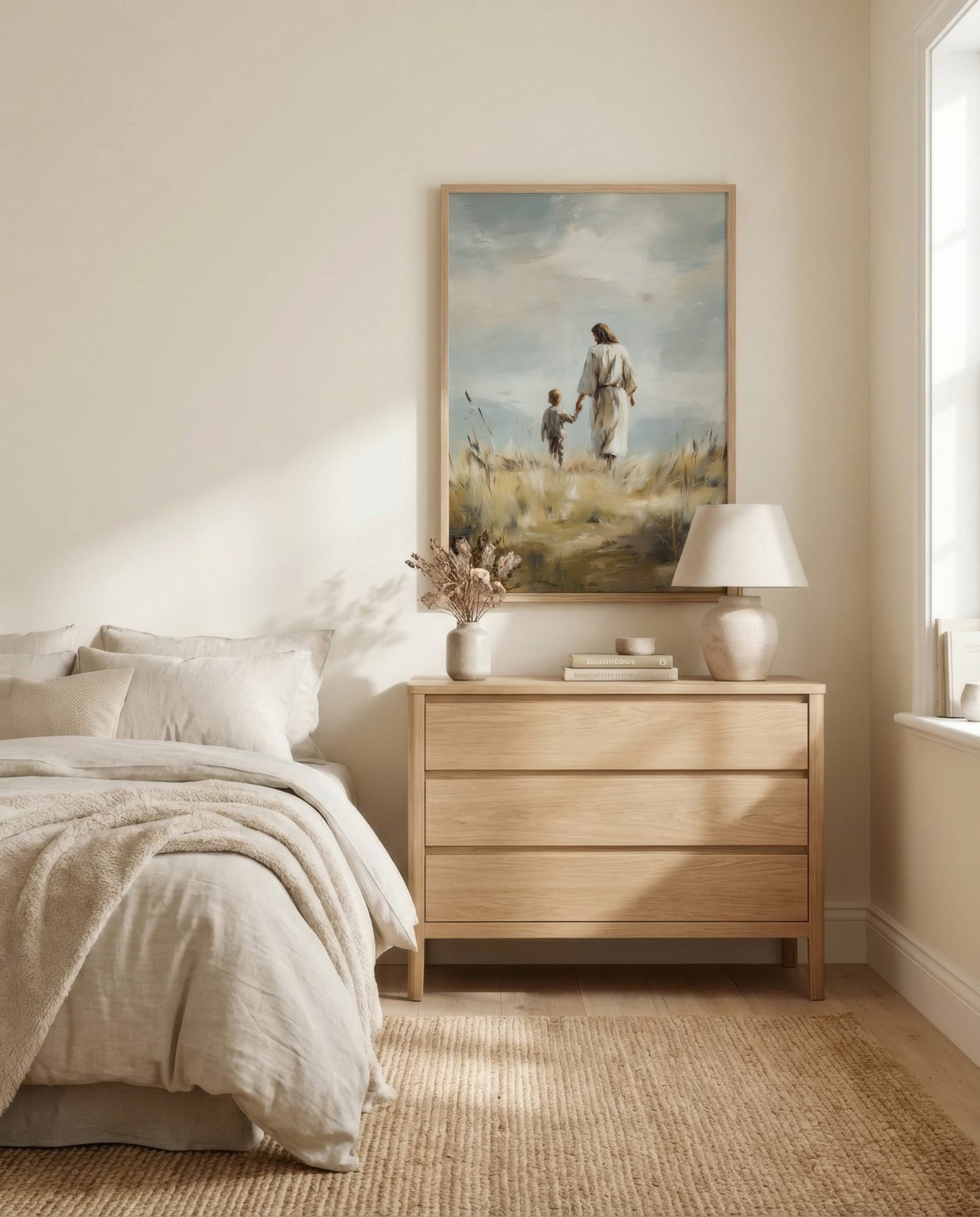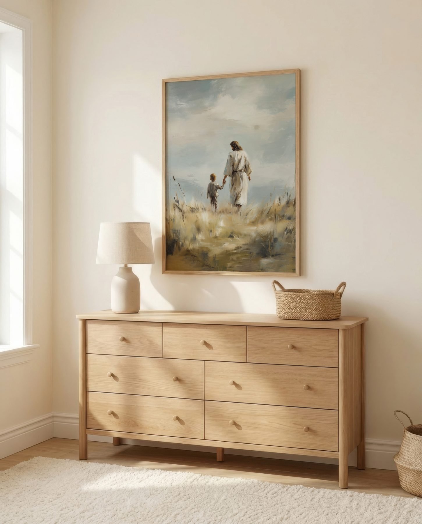 The soft impressionistic illustration approach and cream, sage green, golden wheat, soft blue palette keep it gentle in a nursery, pairing naturally with wood furniture, soft bedding, and quiet neutrals.