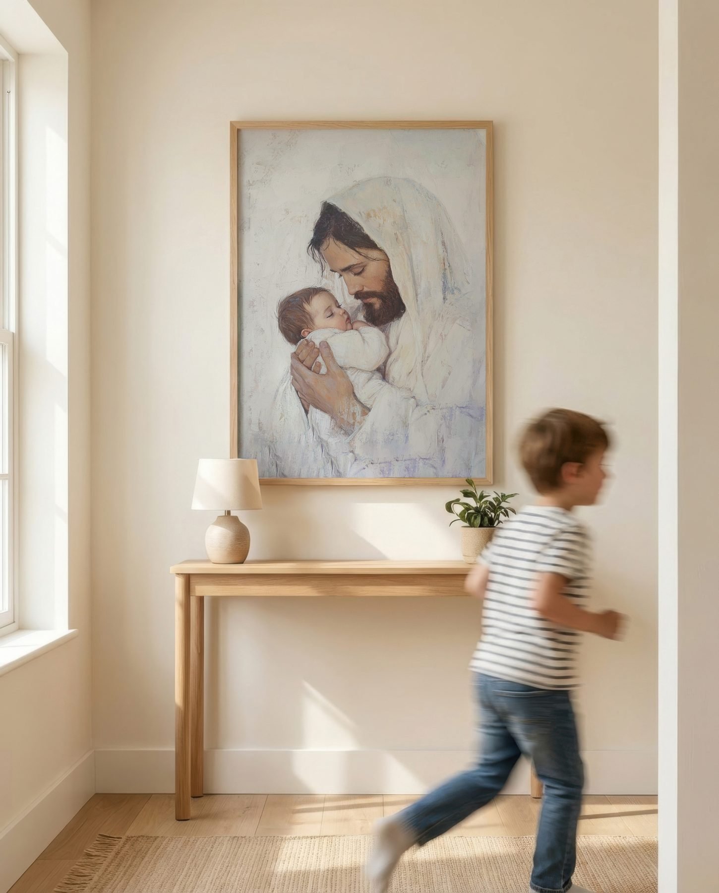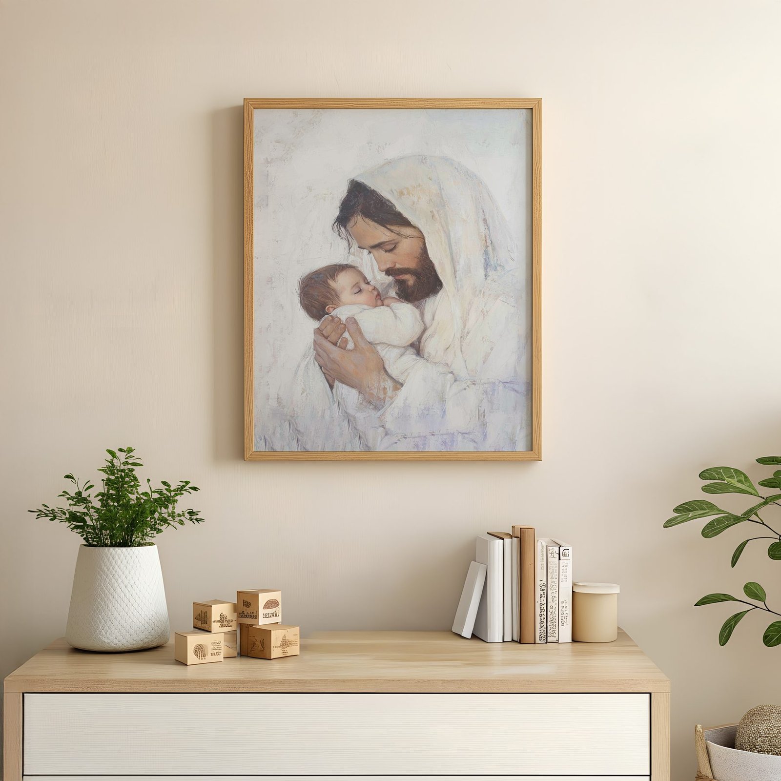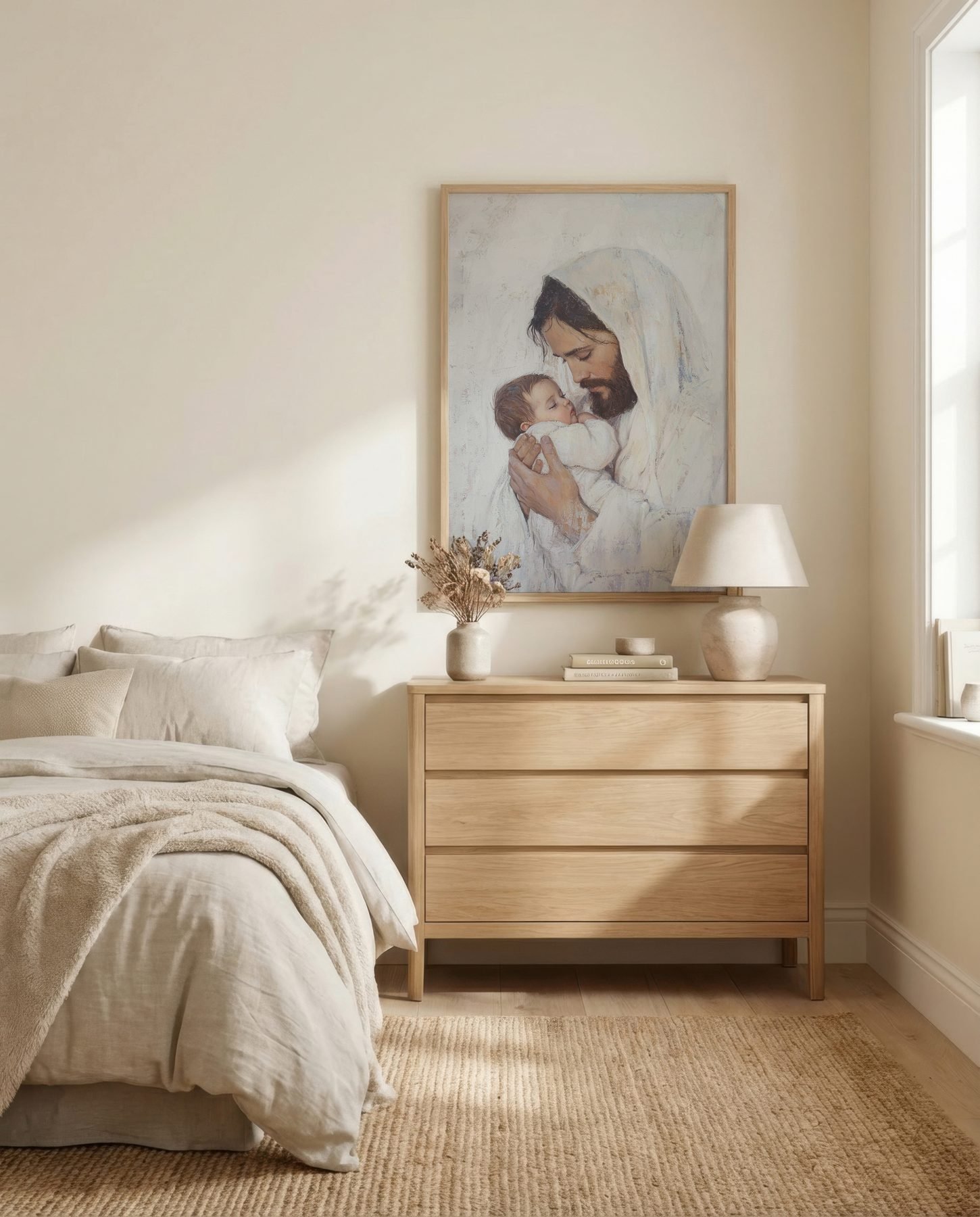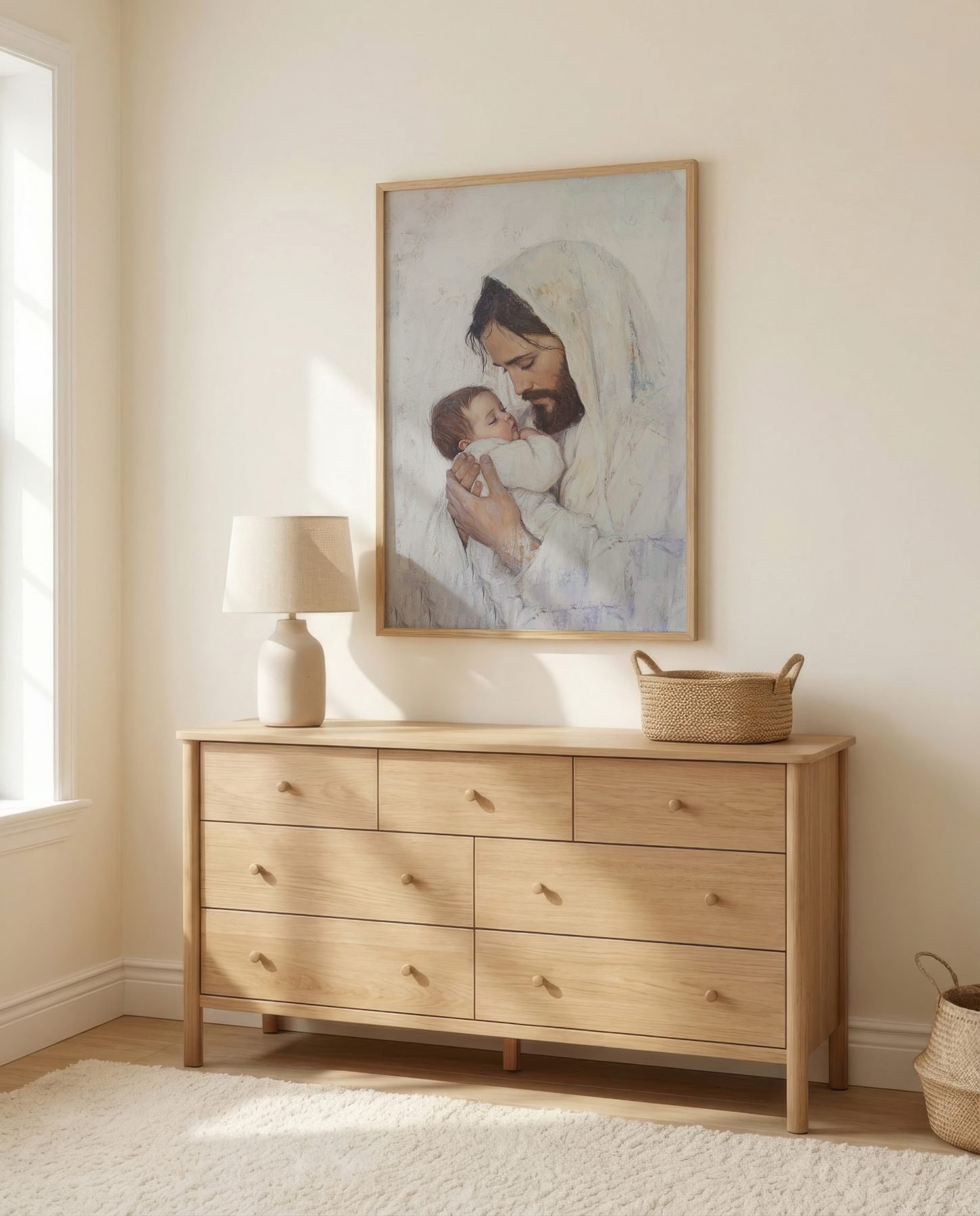 The soft watercolor illustration approach and cream, soft blue, warm beige, gentle gray palette keep it gentle in a nursery, pairing naturally with wood furniture, soft bedding, and quiet neutrals.