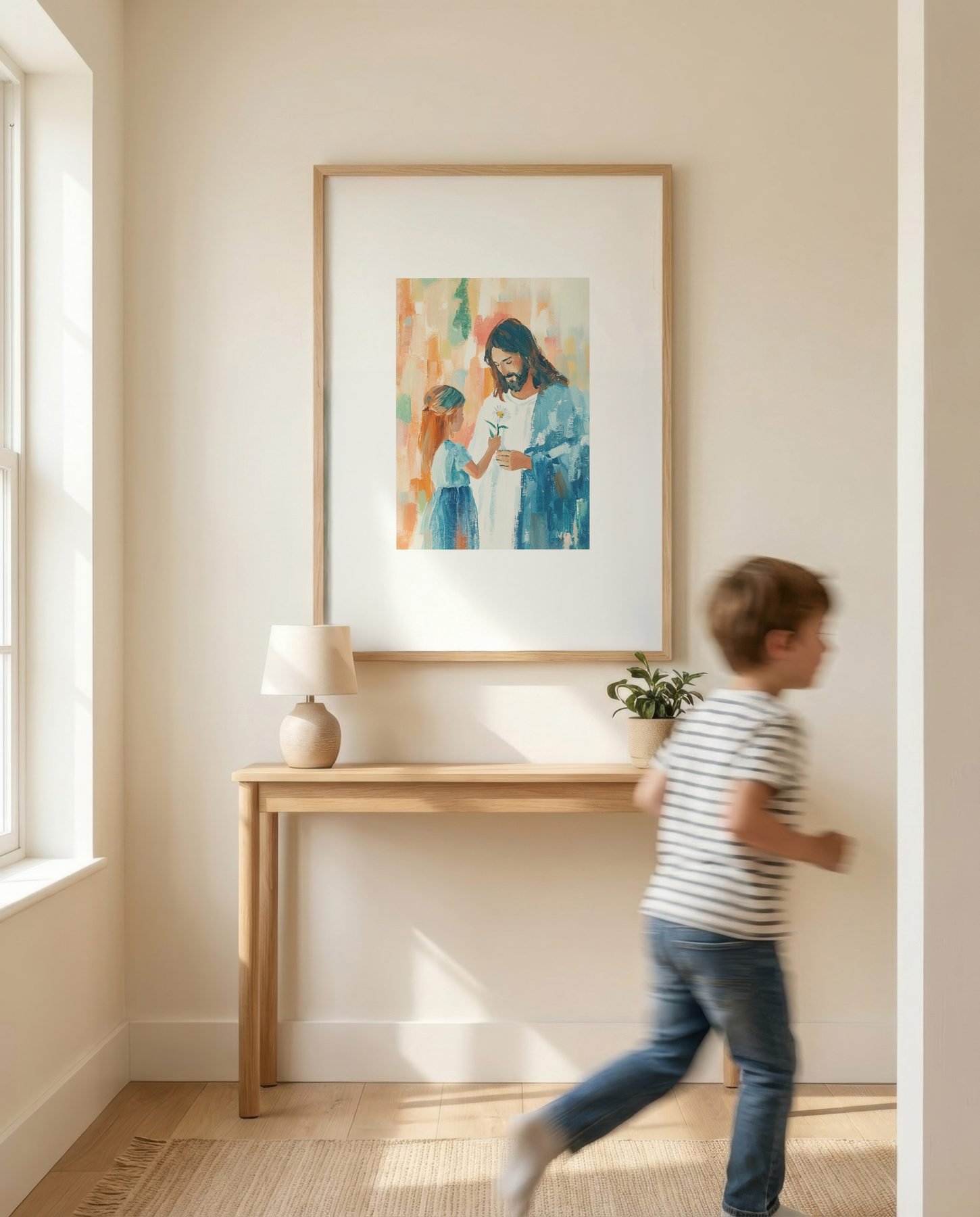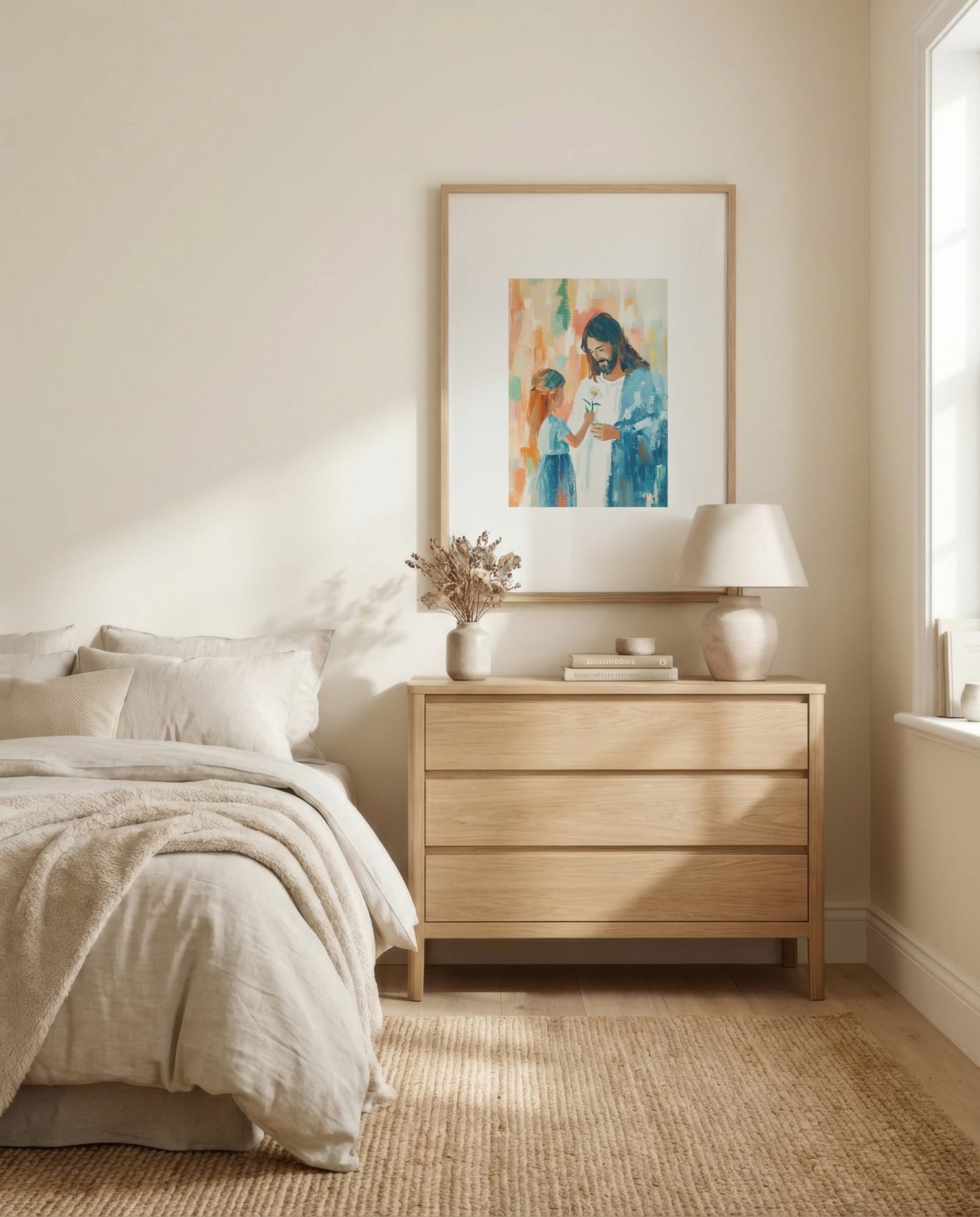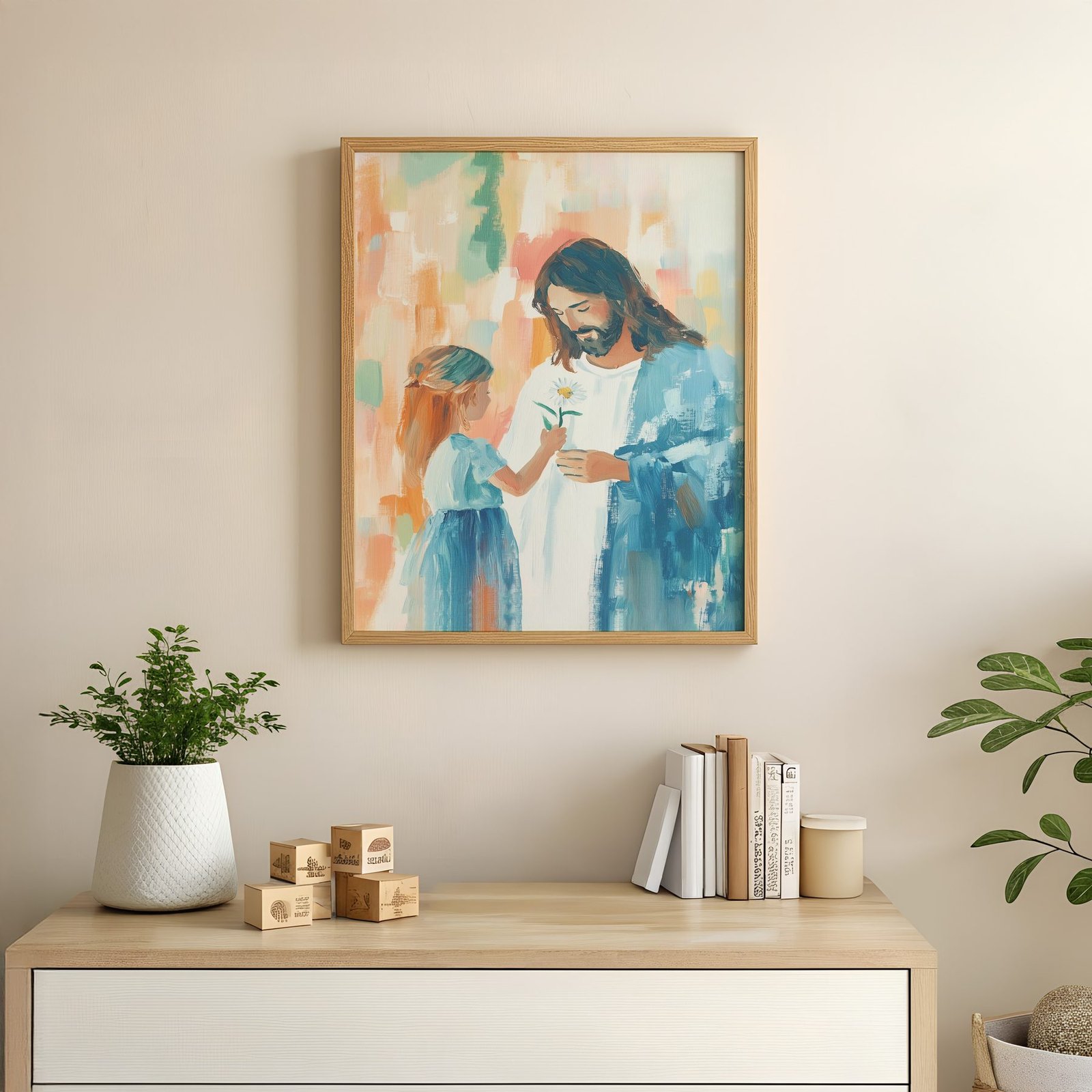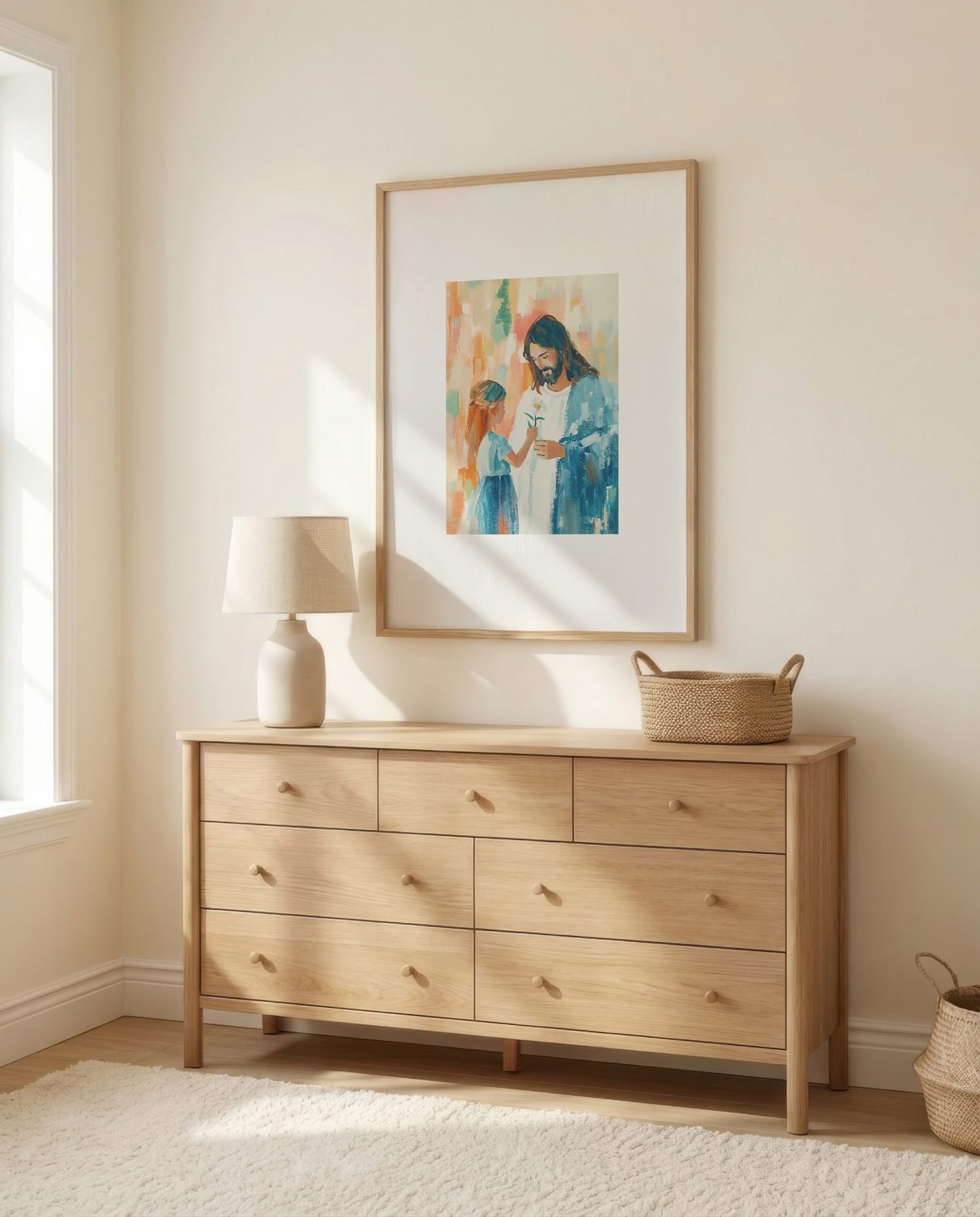 The soft watercolor illustration approach and sage green, coral pink, cream, golden yellow, soft blue palette keep it gentle in a nursery, pairing naturally with wood furniture, soft bedding, and quiet neutrals.