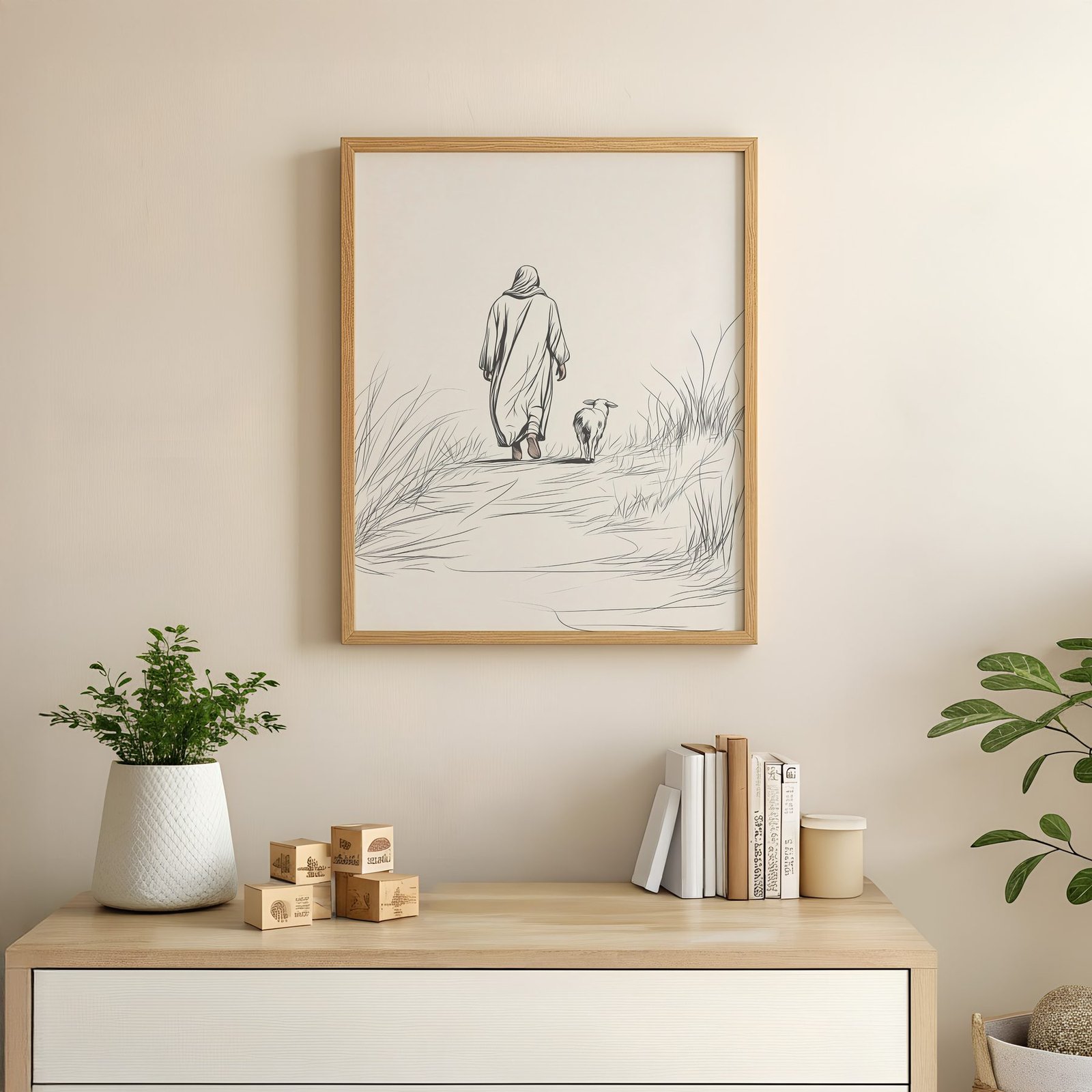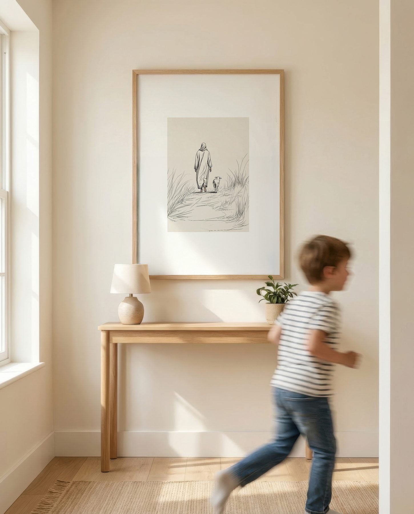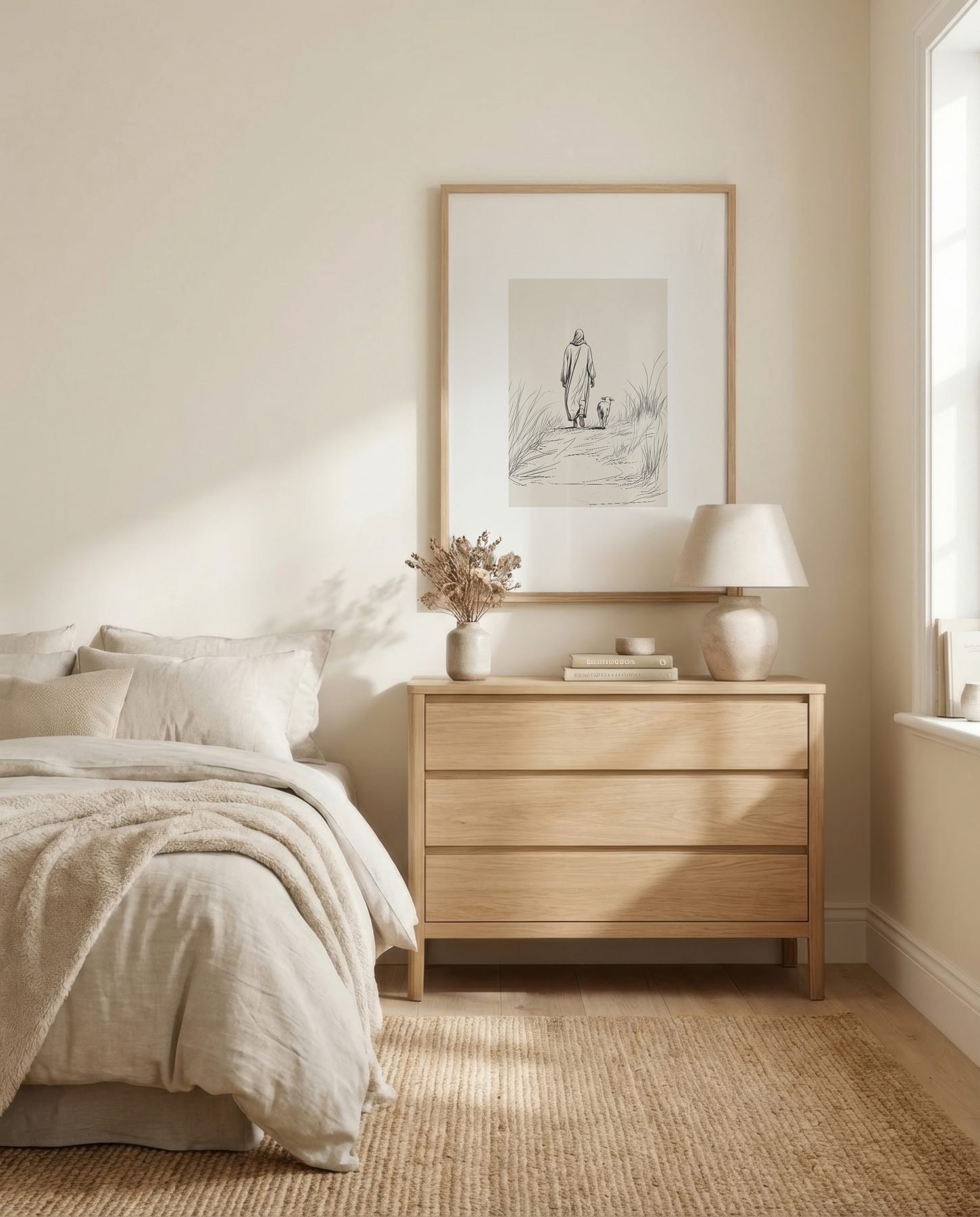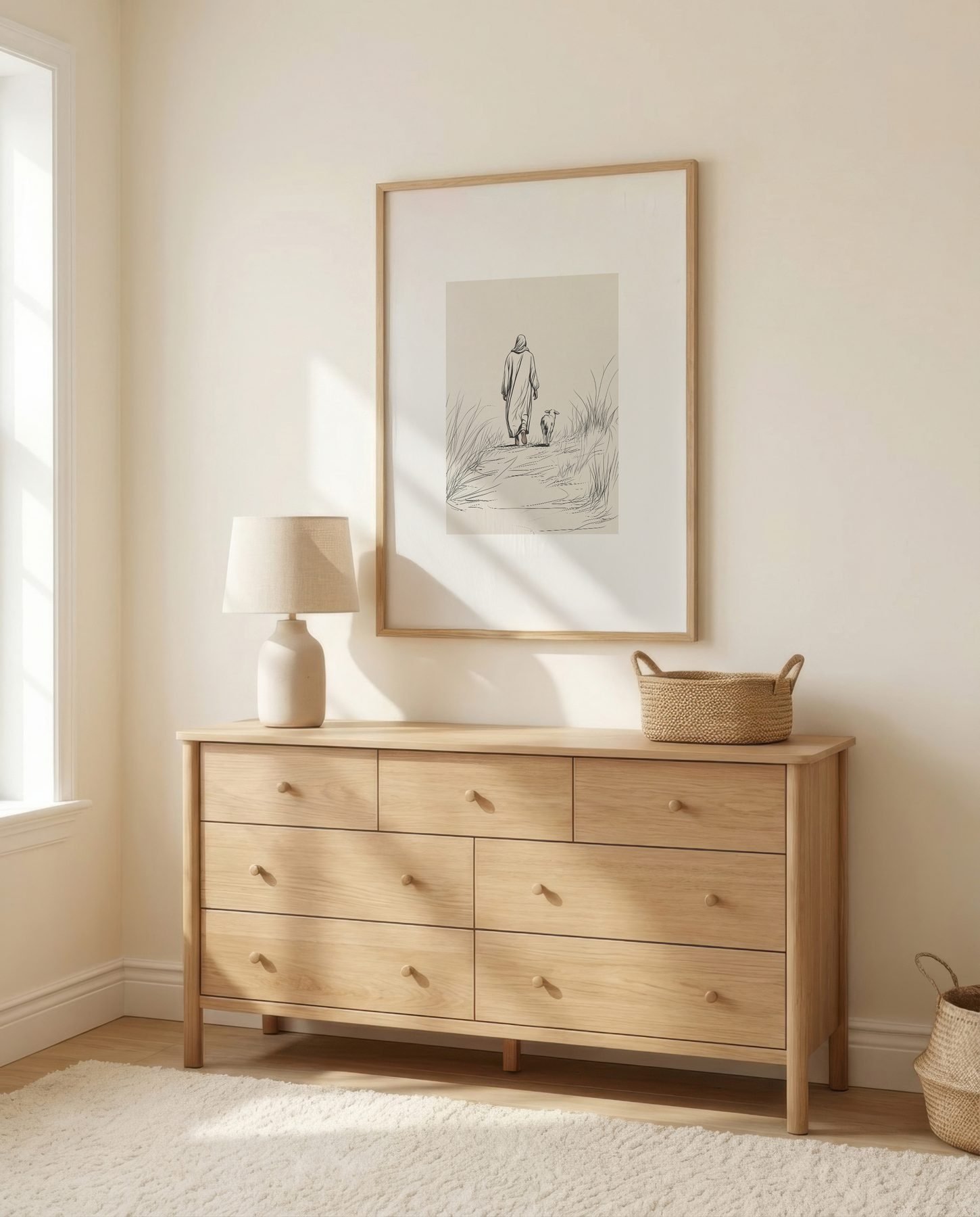 The minimalist line art approach and cream, soft beige, charcoal gray palette keep it gentle in a nursery, pairing naturally with wood furniture, soft bedding, and quiet neutrals.