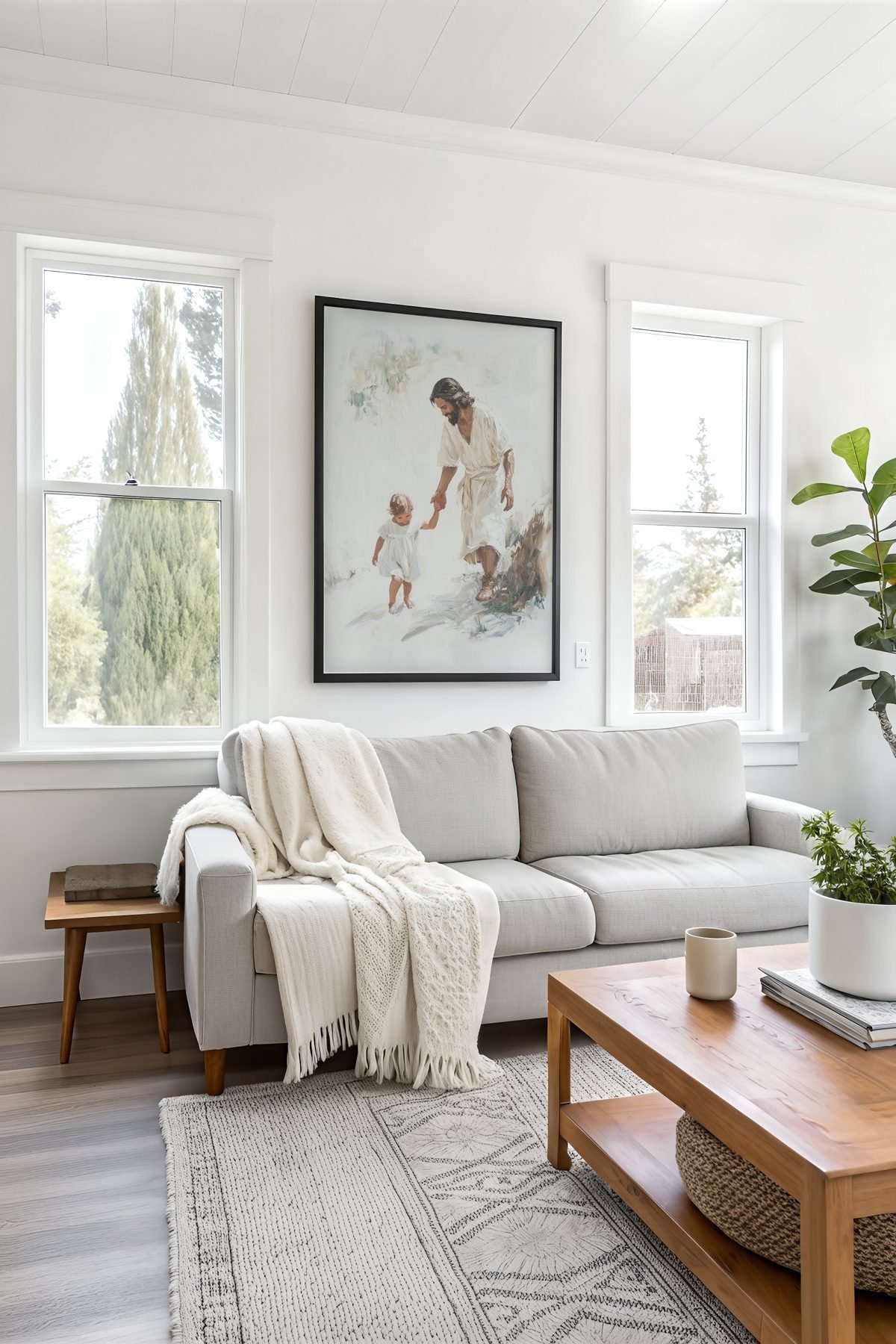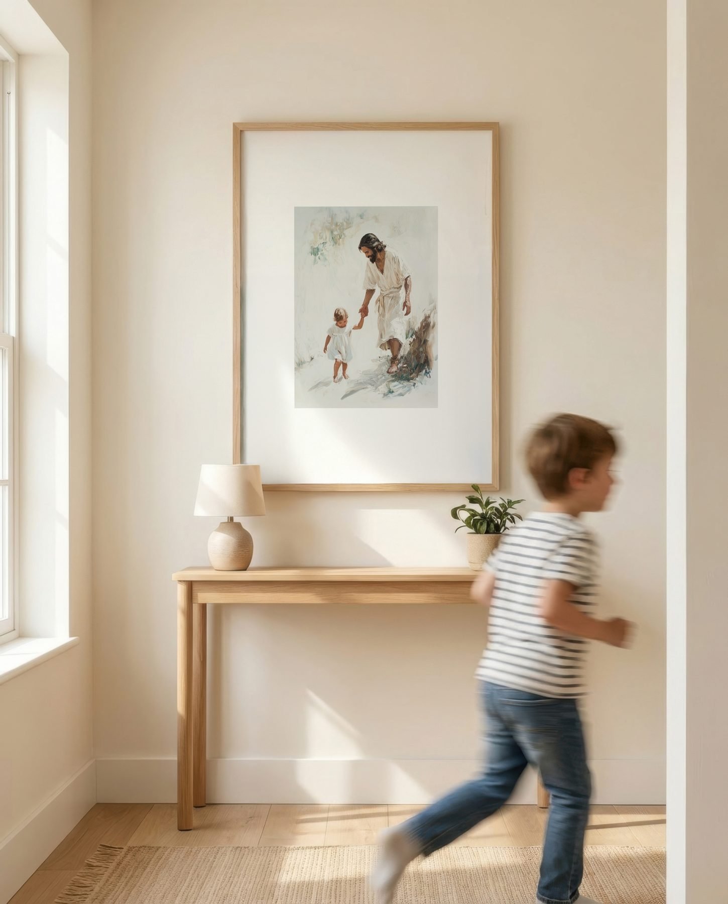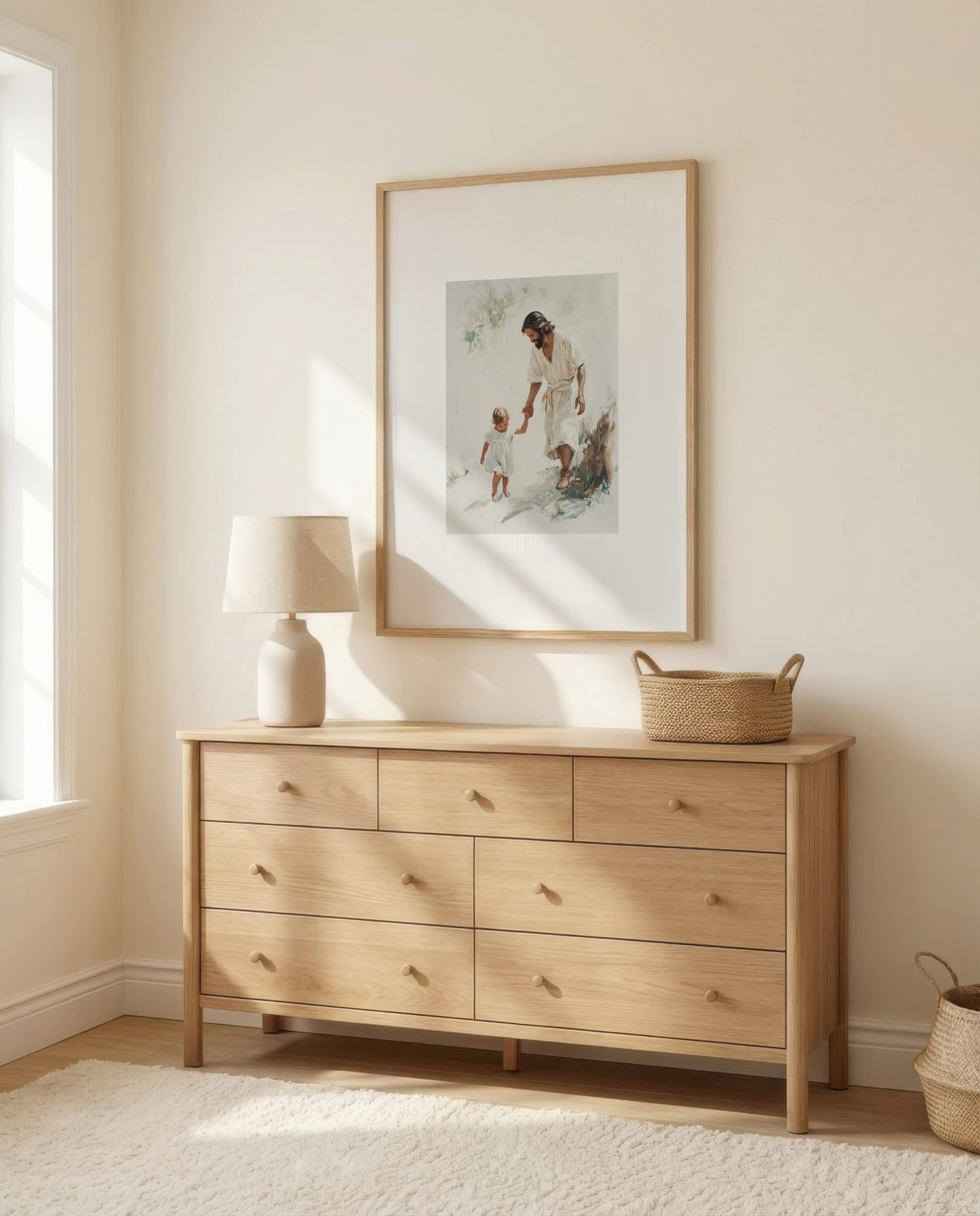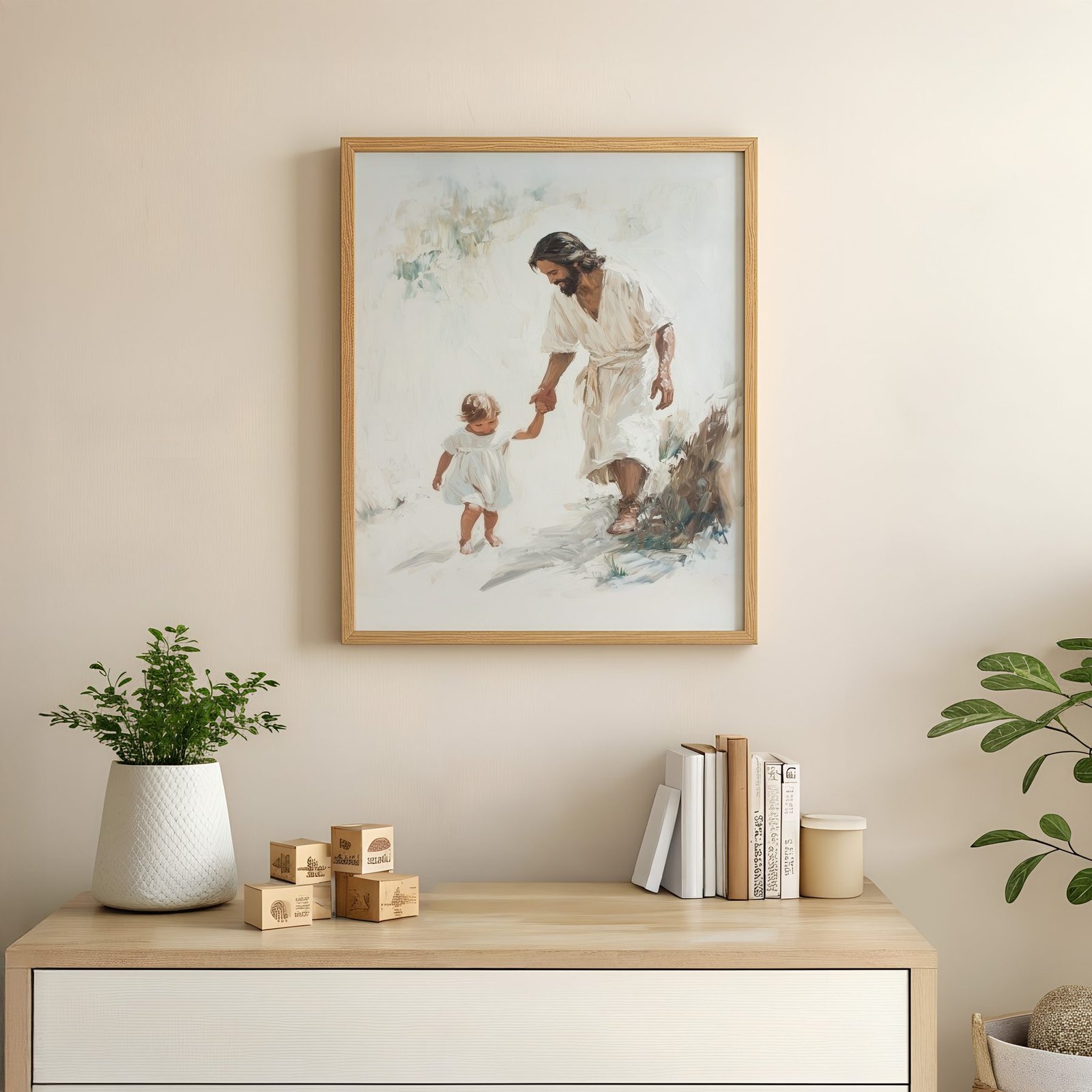 The soft watercolor illustration approach and cream, sage green, warm brown, golden beige palette keep it gentle in a nursery, pairing naturally with wood furniture, soft bedding, and quiet neutrals.