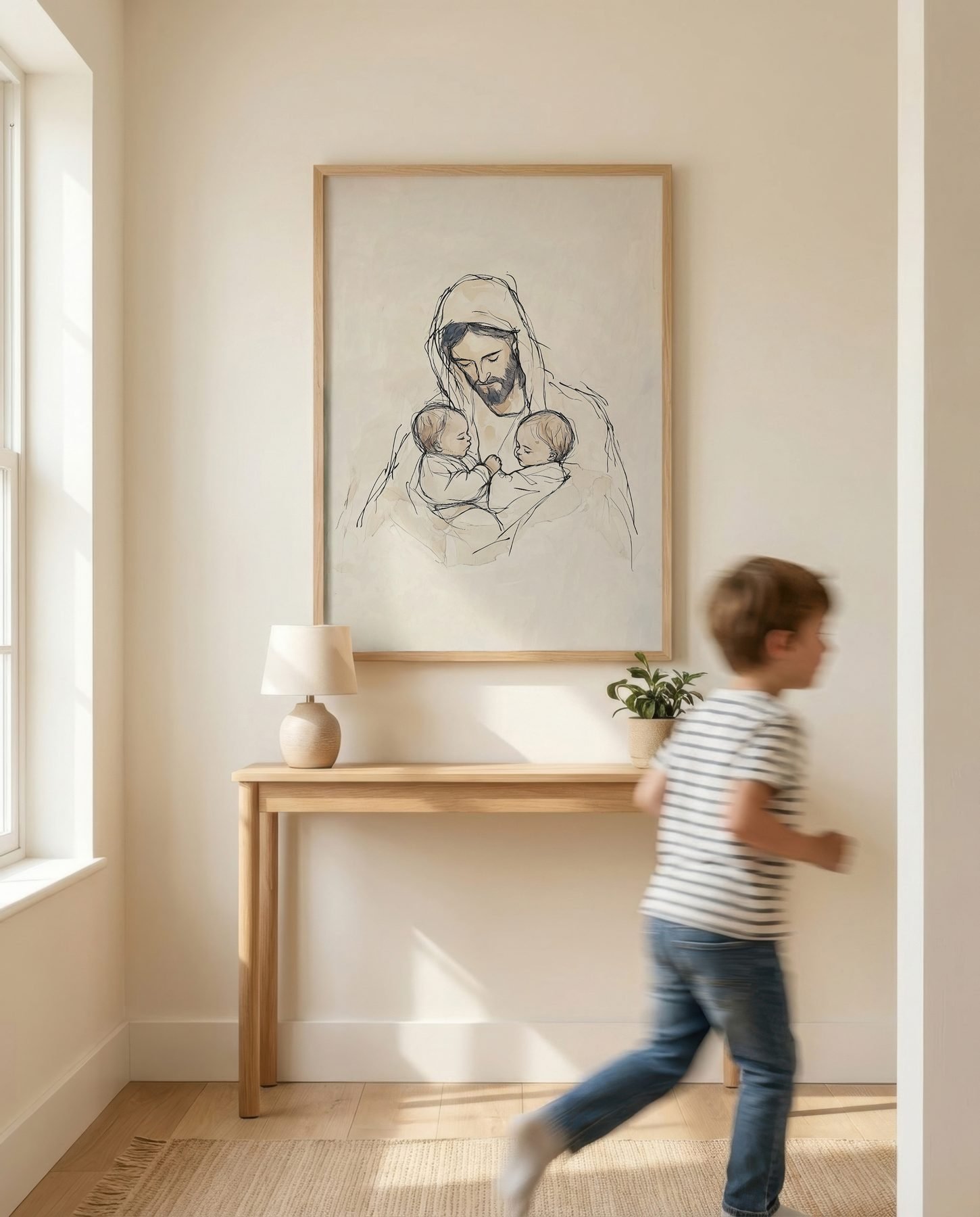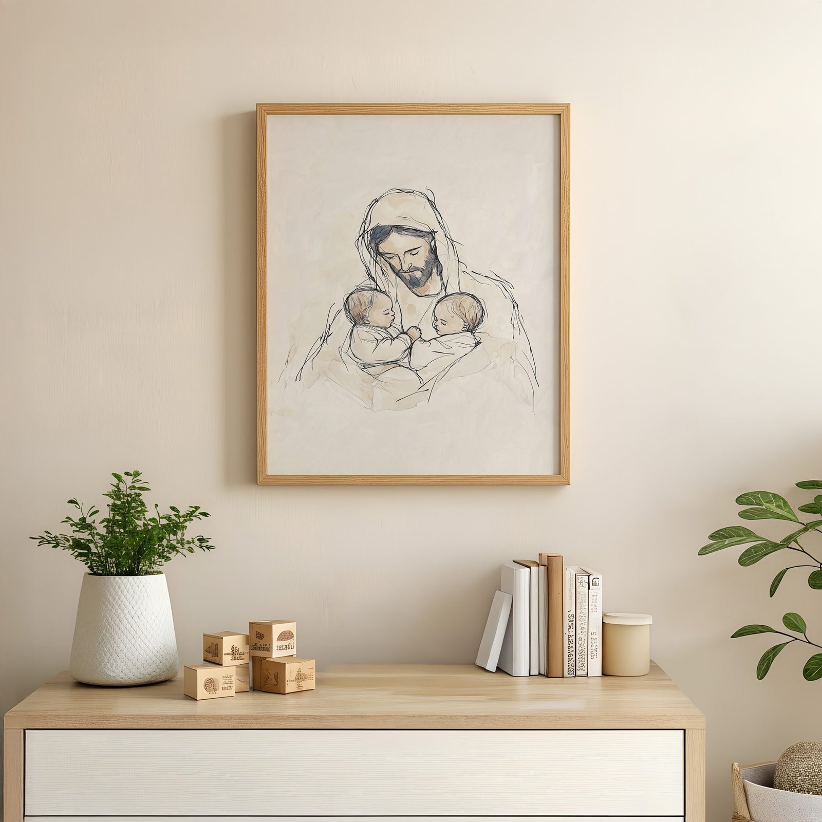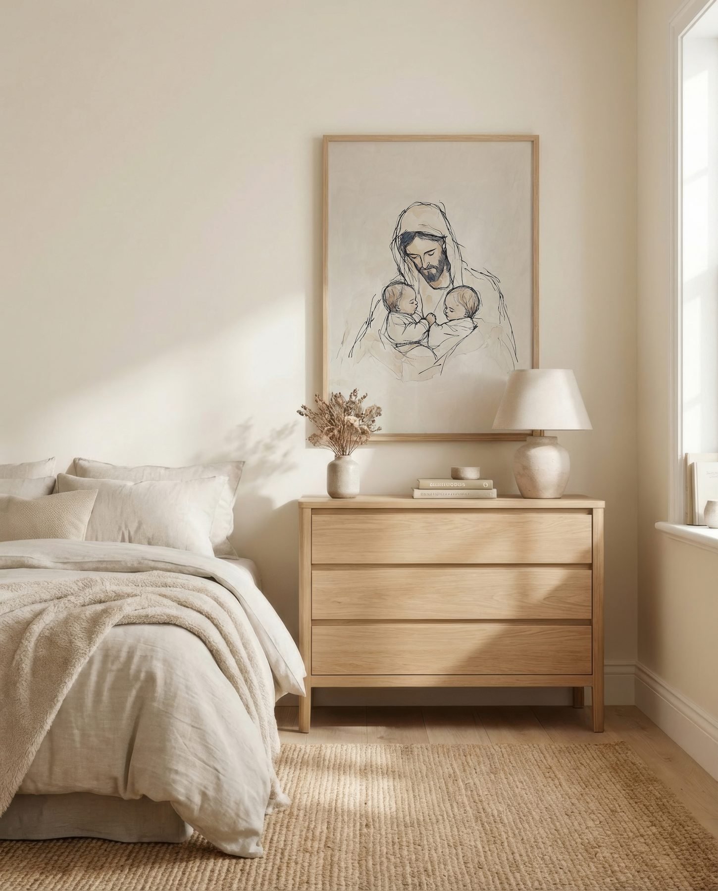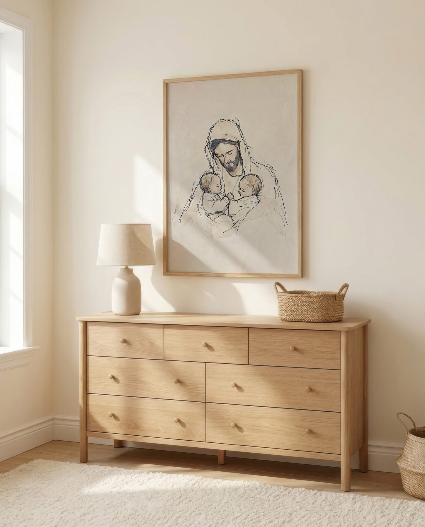 The soft line art illustration approach and cream, warm beige, charcoal gray, soft brown palette keep it gentle in a nursery, pairing naturally with wood furniture, soft bedding, and quiet neutrals.