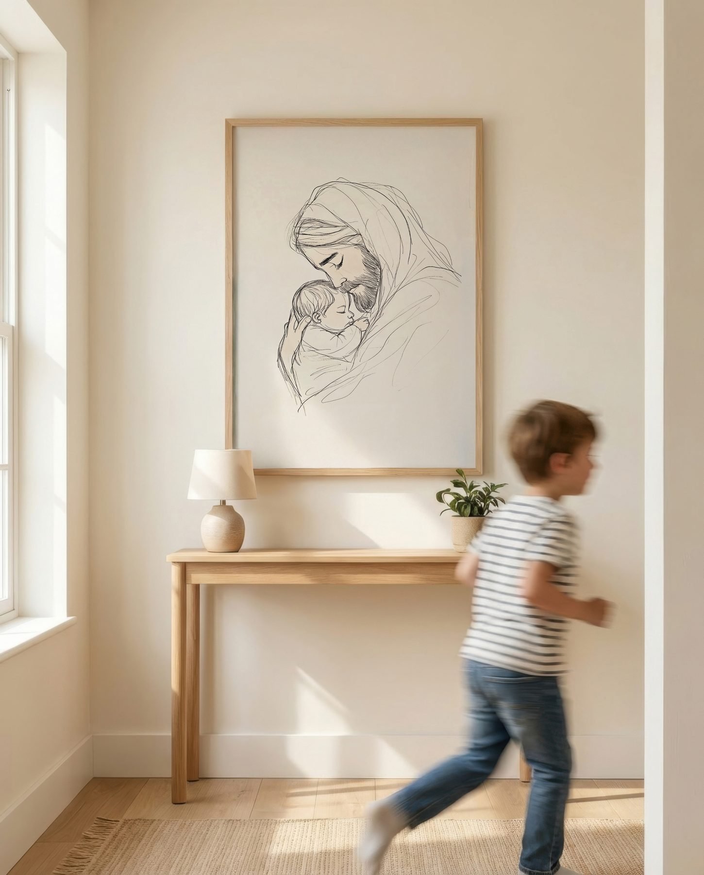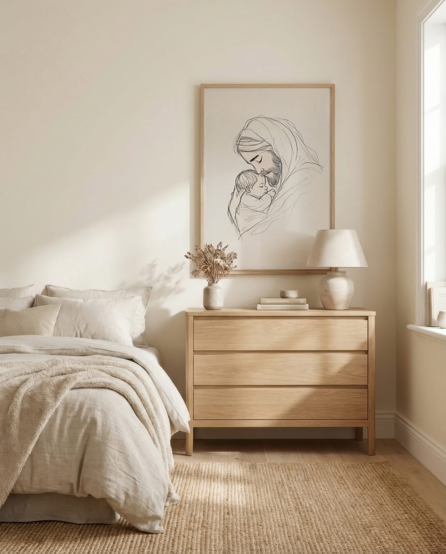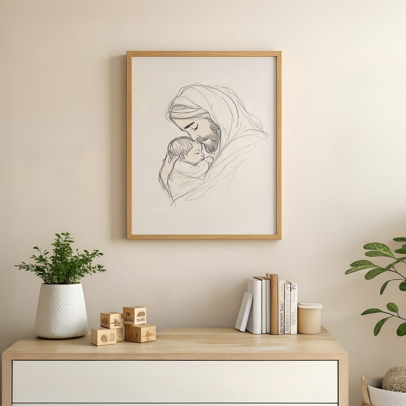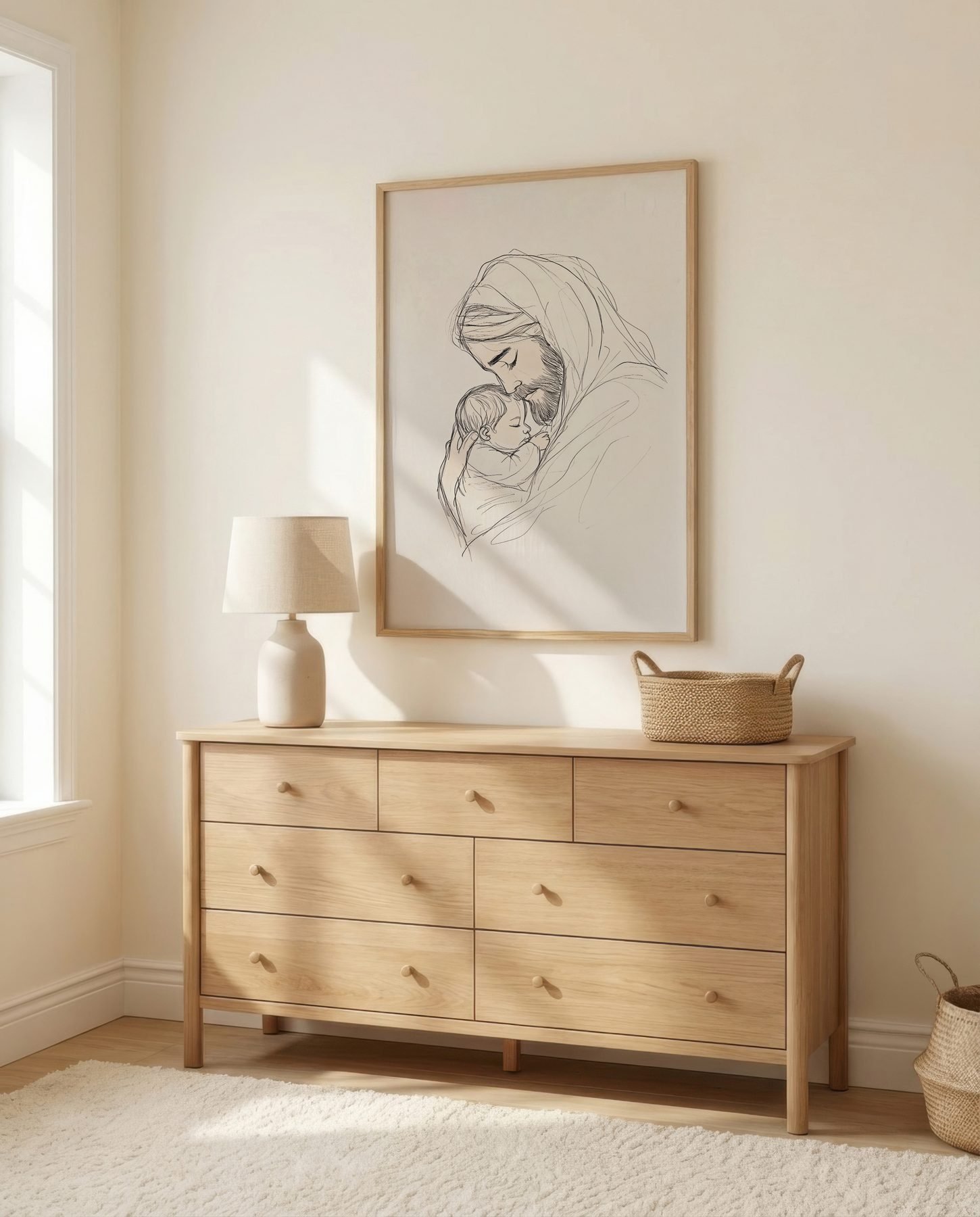The soft line art illustration approach and cream, soft beige, warm taupe, gentle brown palette keep it gentle in a nursery, pairing naturally with wood furniture, soft bedding, and quiet neutrals.