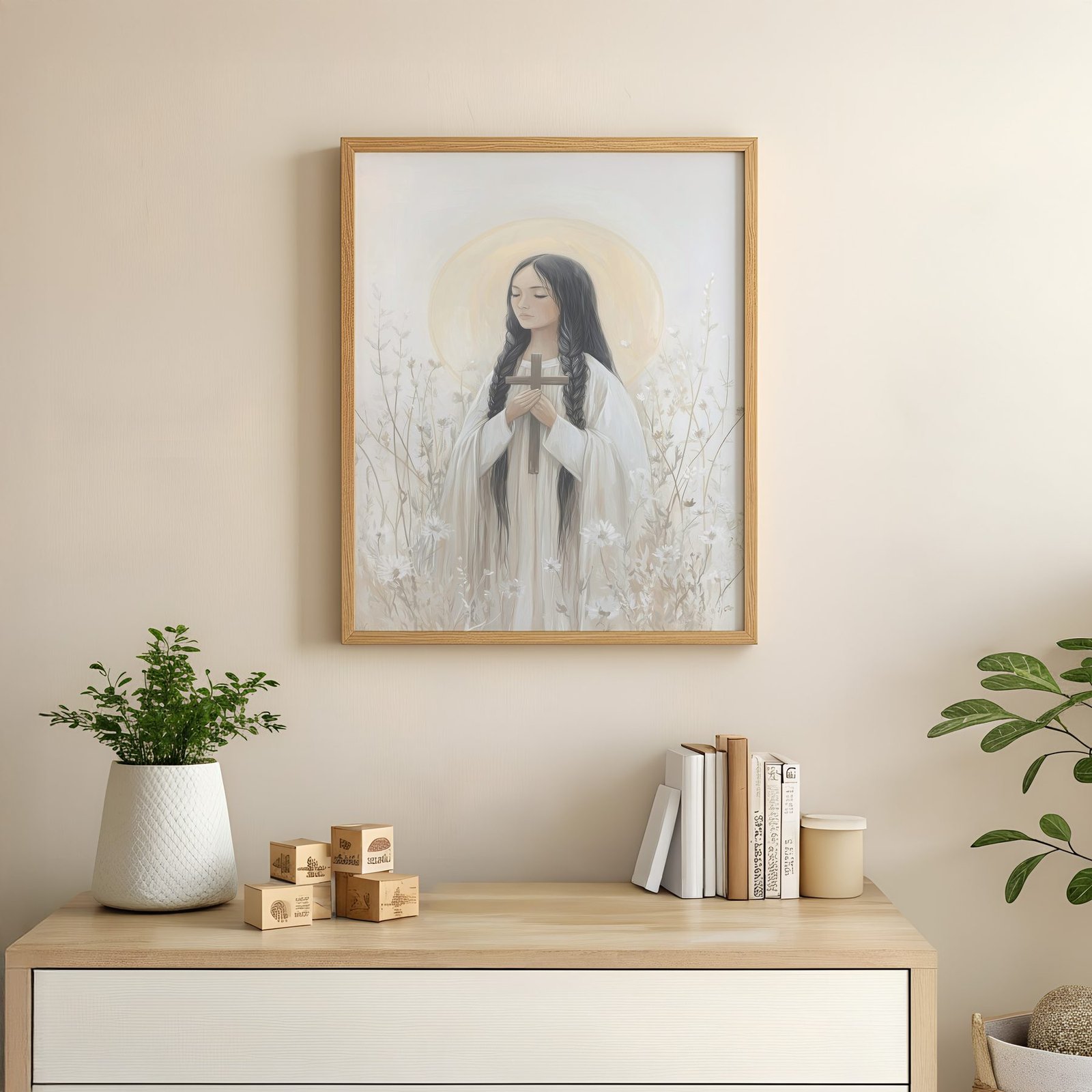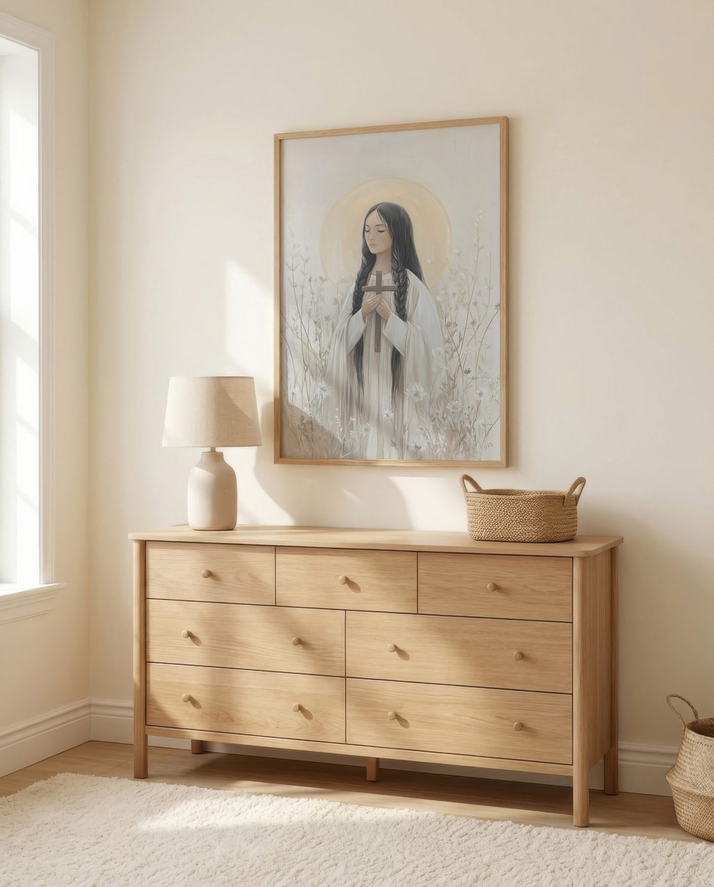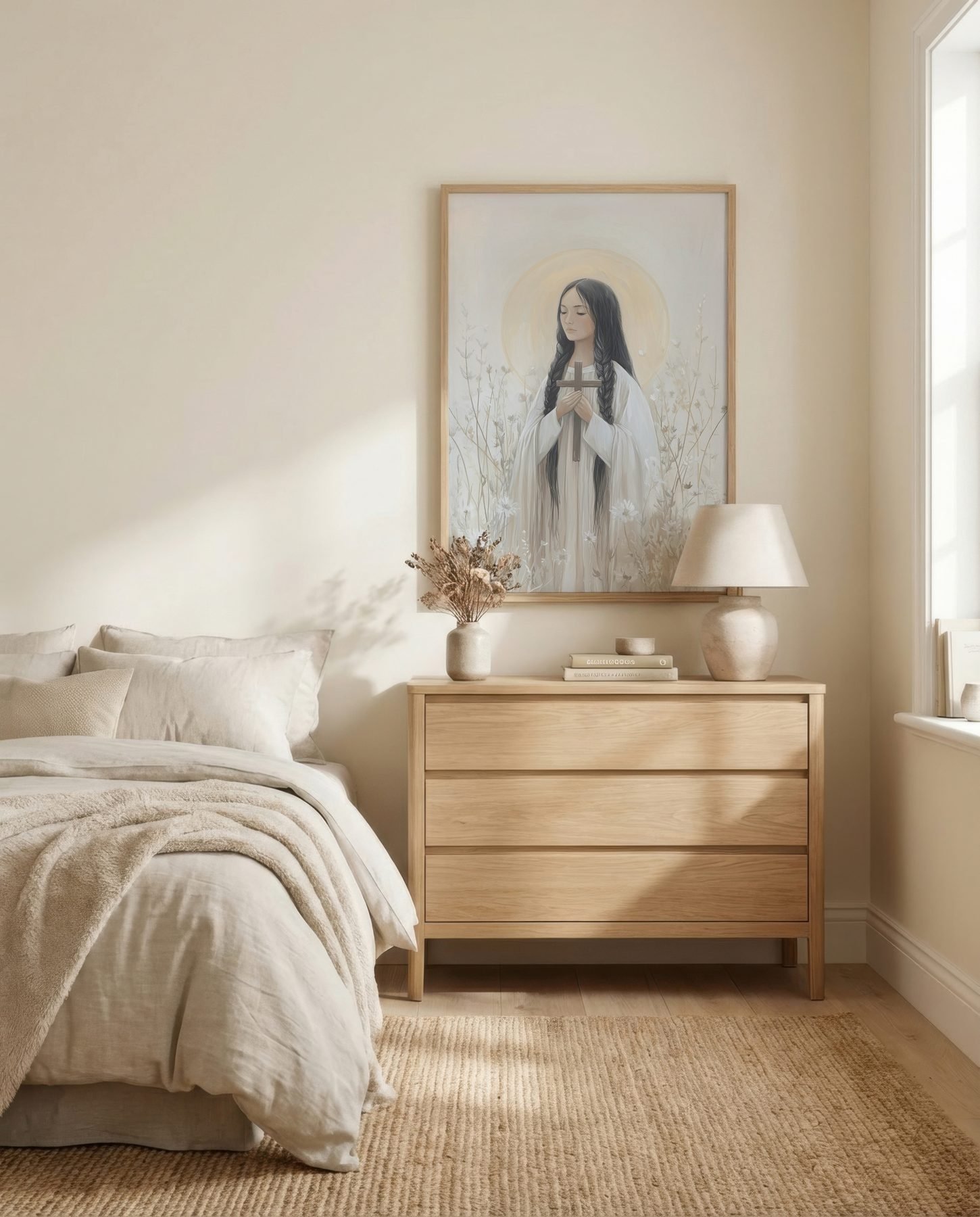 The soft watercolor illustration approach and cream, sage green, soft gray, golden yellow palette give it presence in a prayer corner while still sitting naturally with wood, linen, and neutral walls.