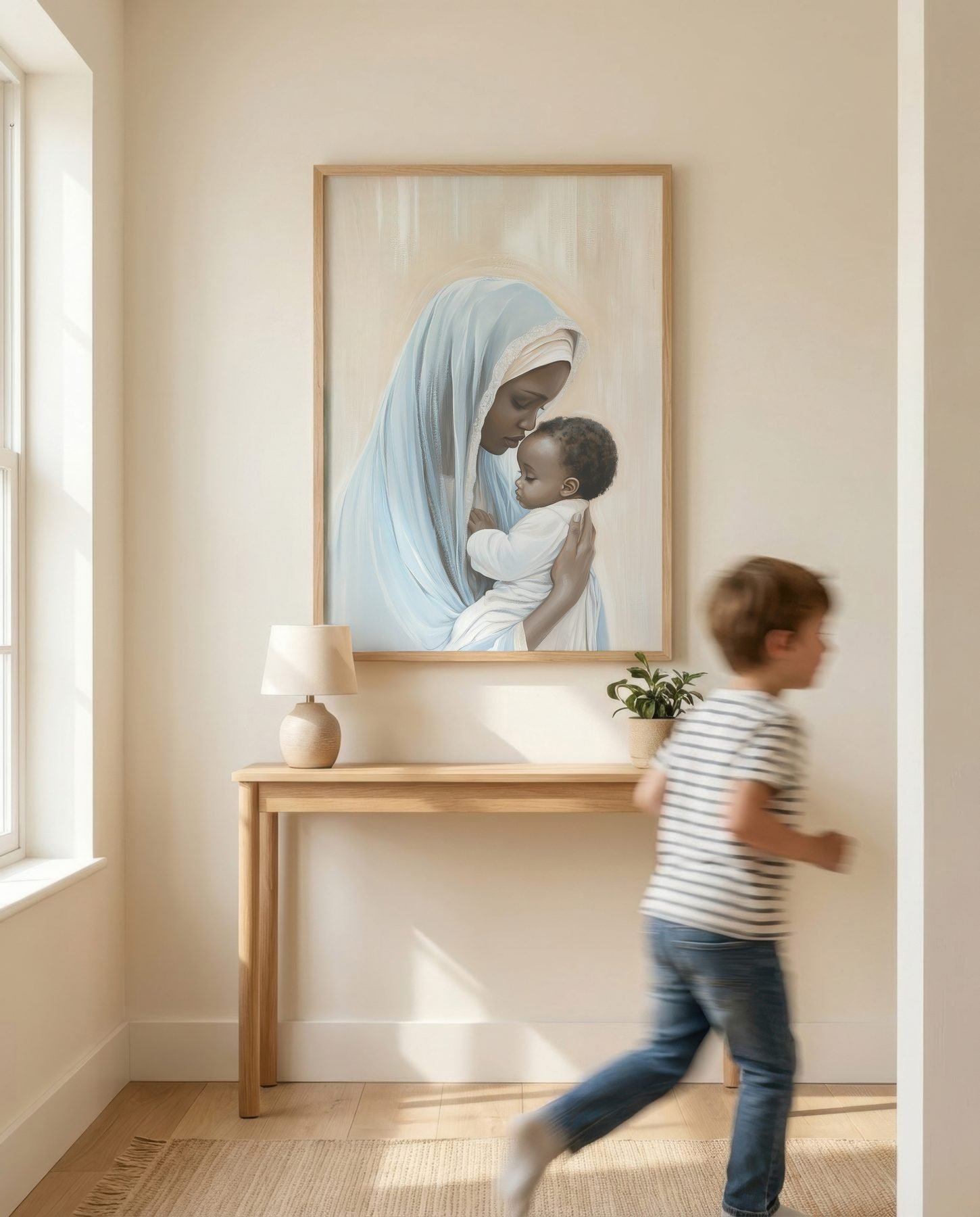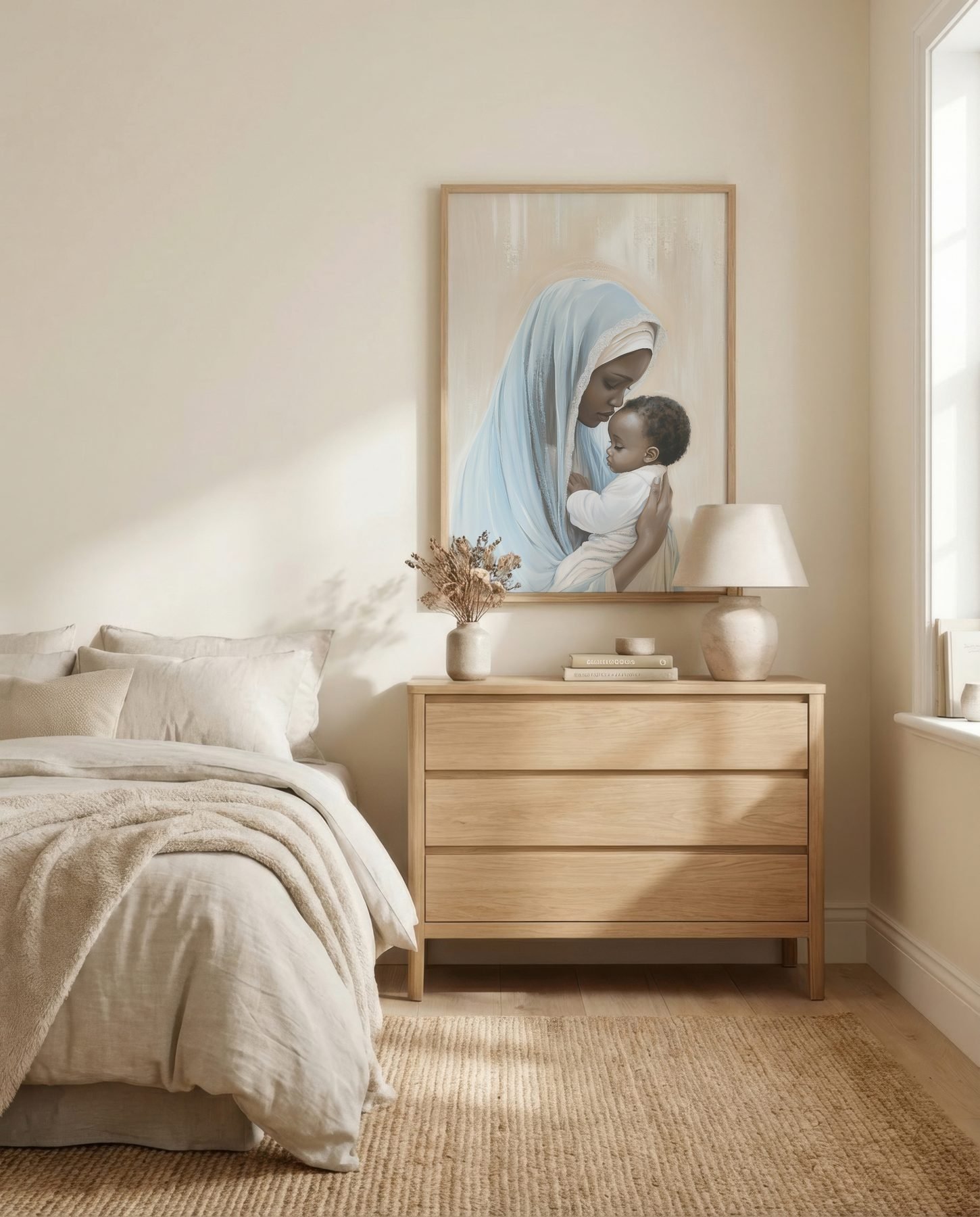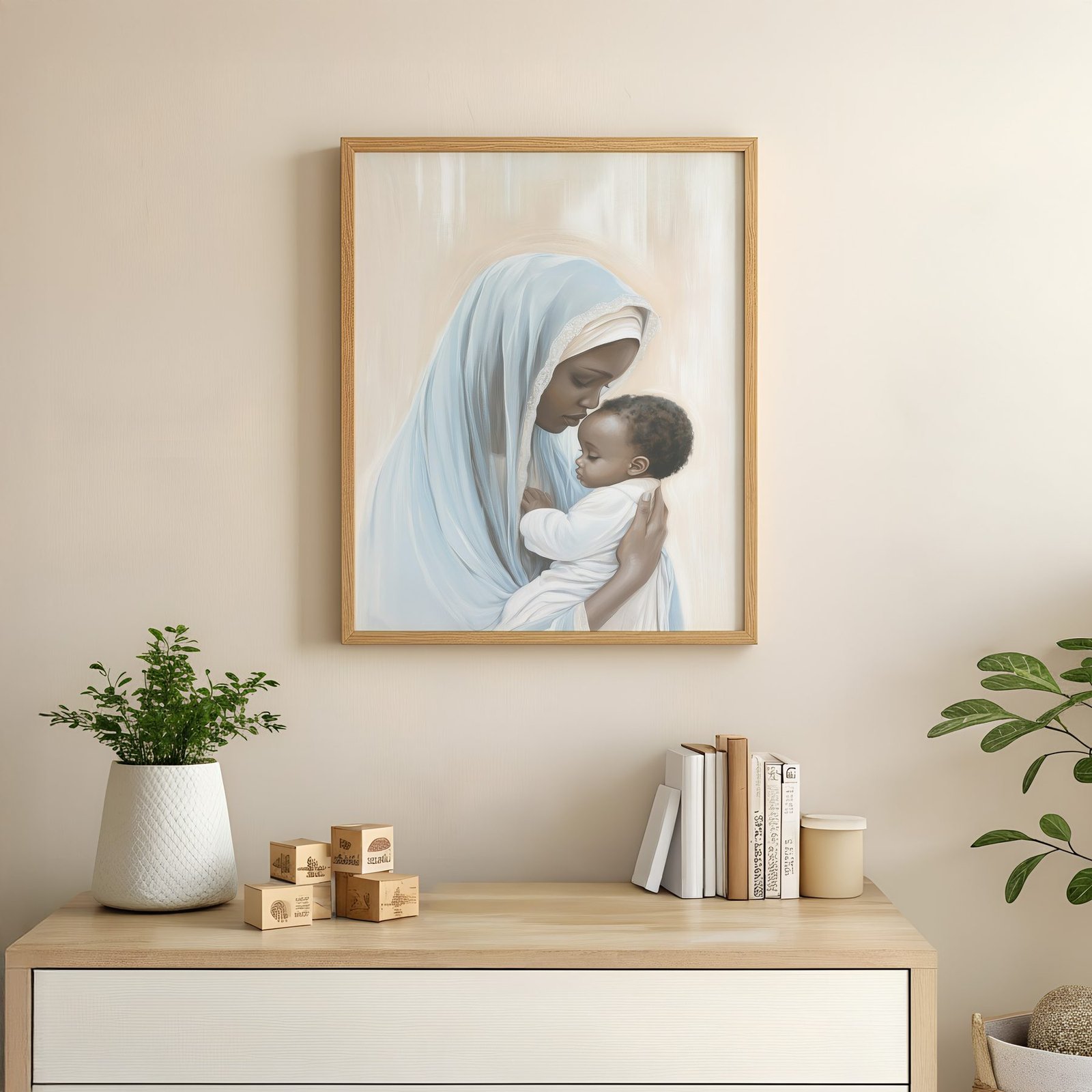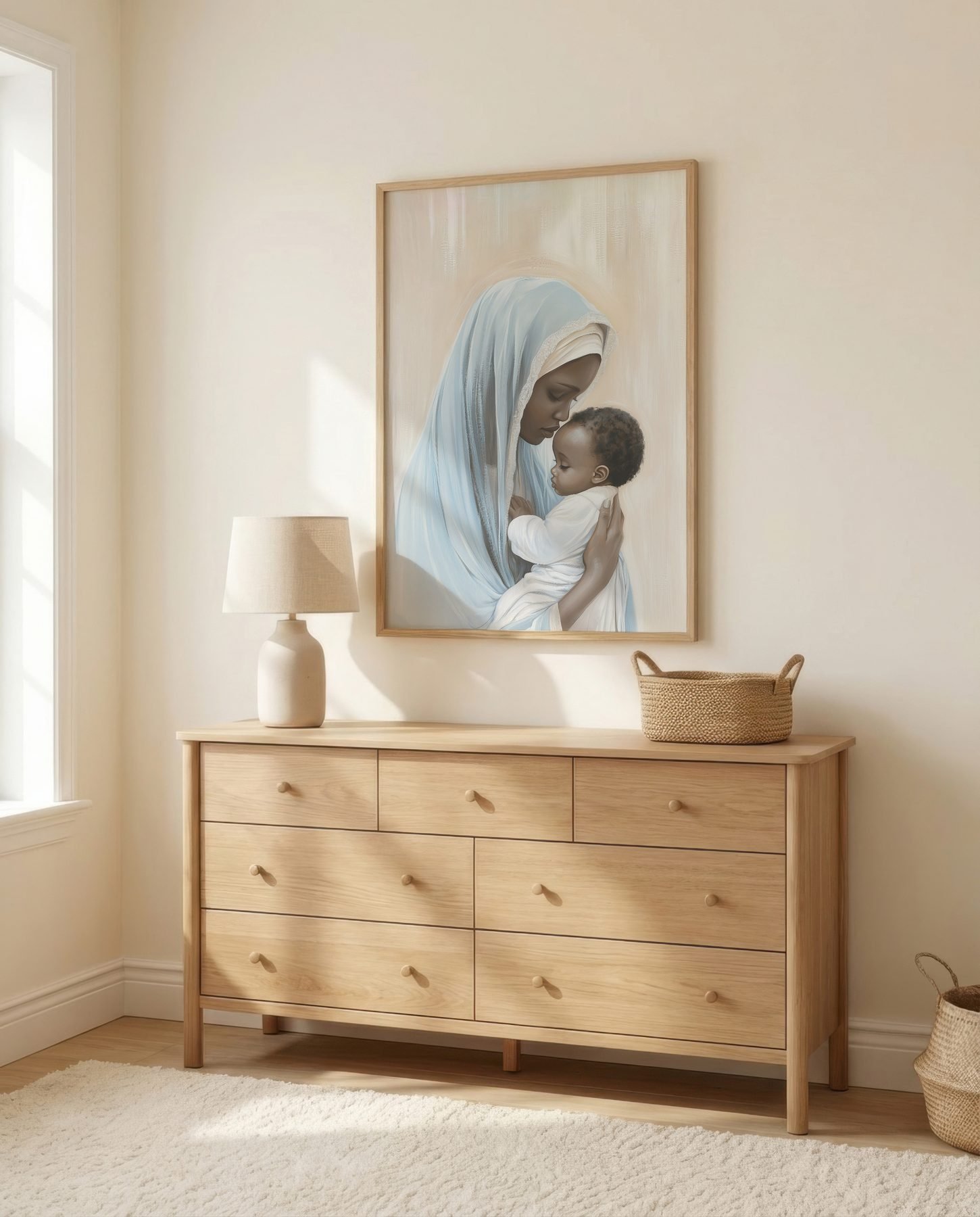 The soft ethereal illustration approach and powder blue, cream white, warm beige, soft brown palette keep it gentle in a nursery, pairing naturally with wood furniture, soft bedding, and quiet neutrals.
