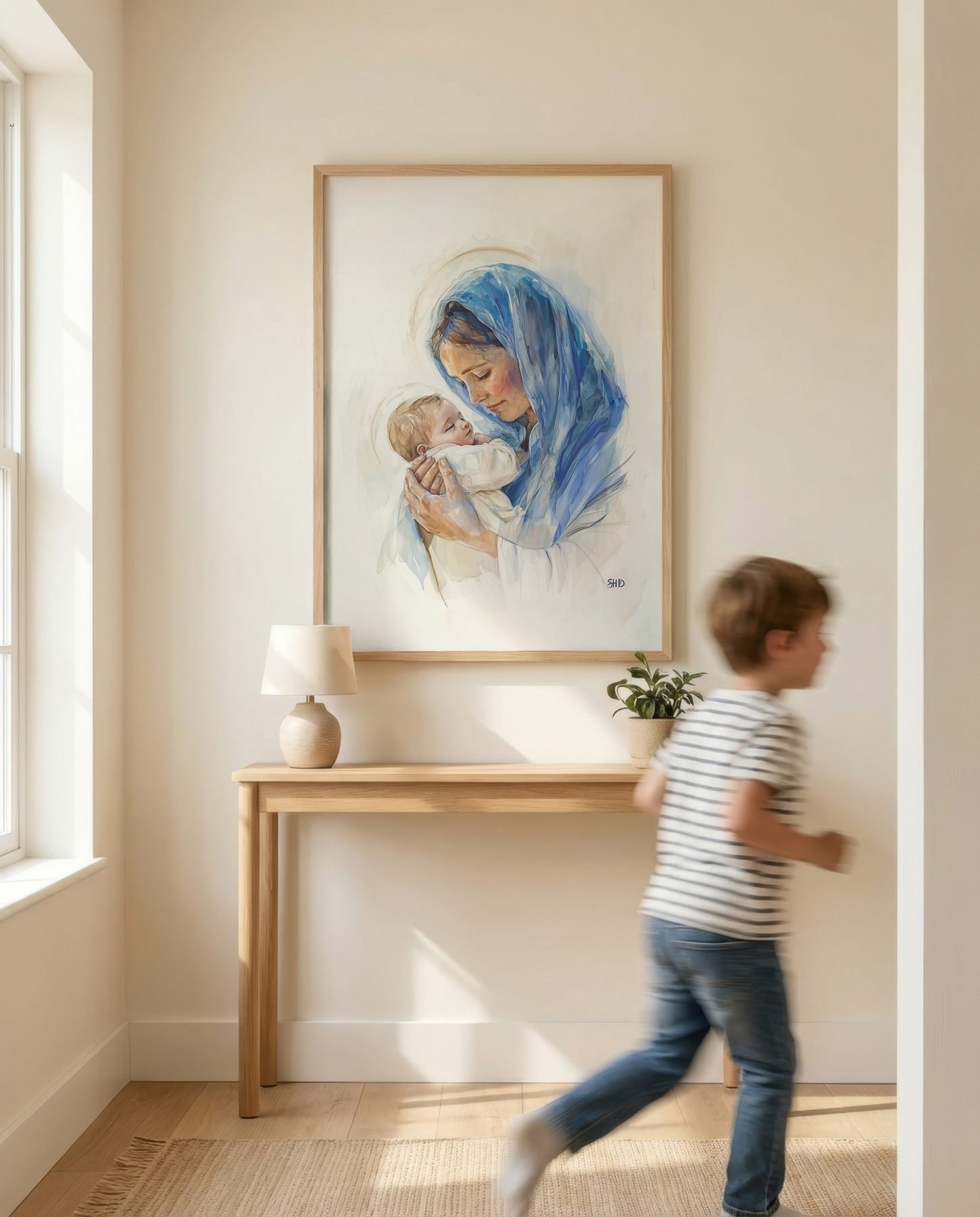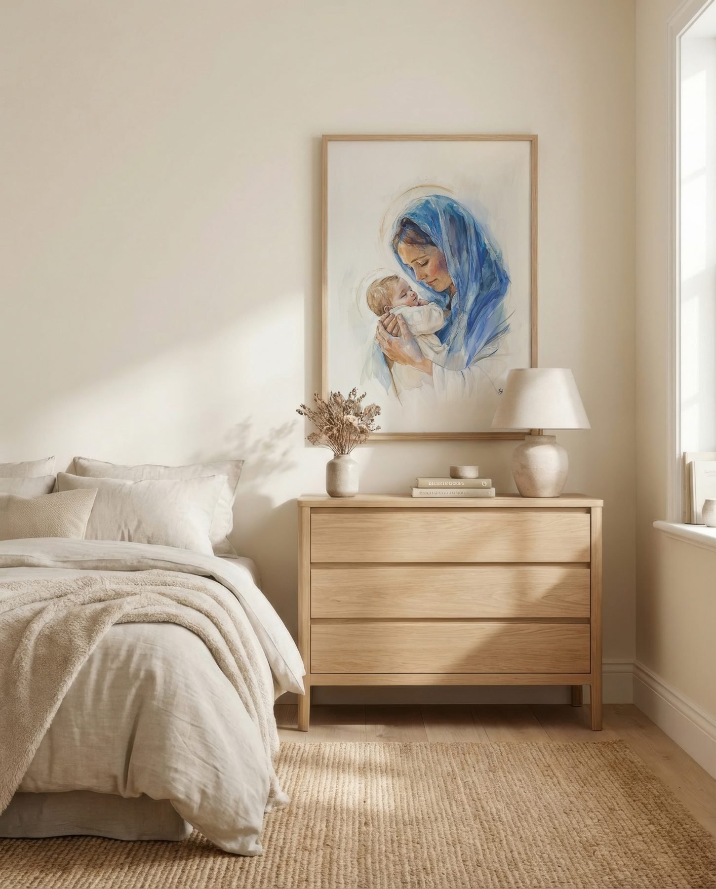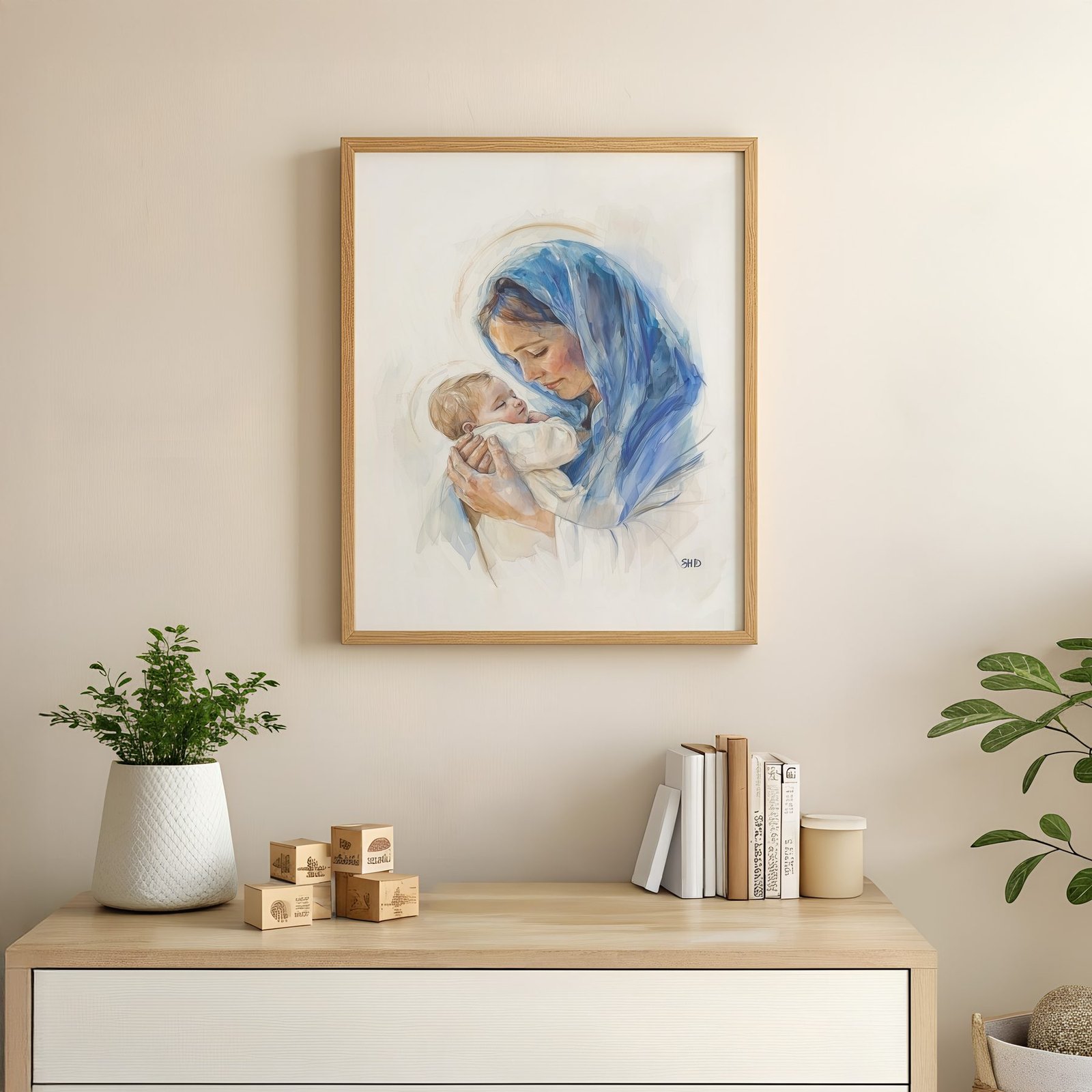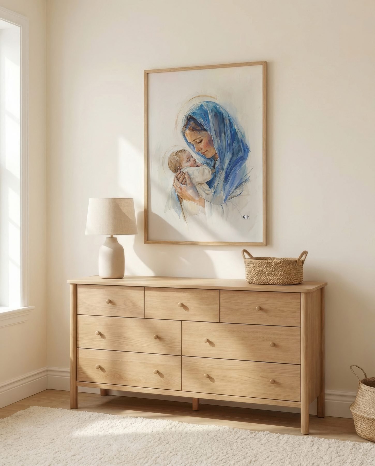 The soft watercolor illustration approach and soft blue, cream, peach, golden brown, white palette keep it gentle in a nursery, pairing naturally with wood furniture, soft bedding, and quiet neutrals.