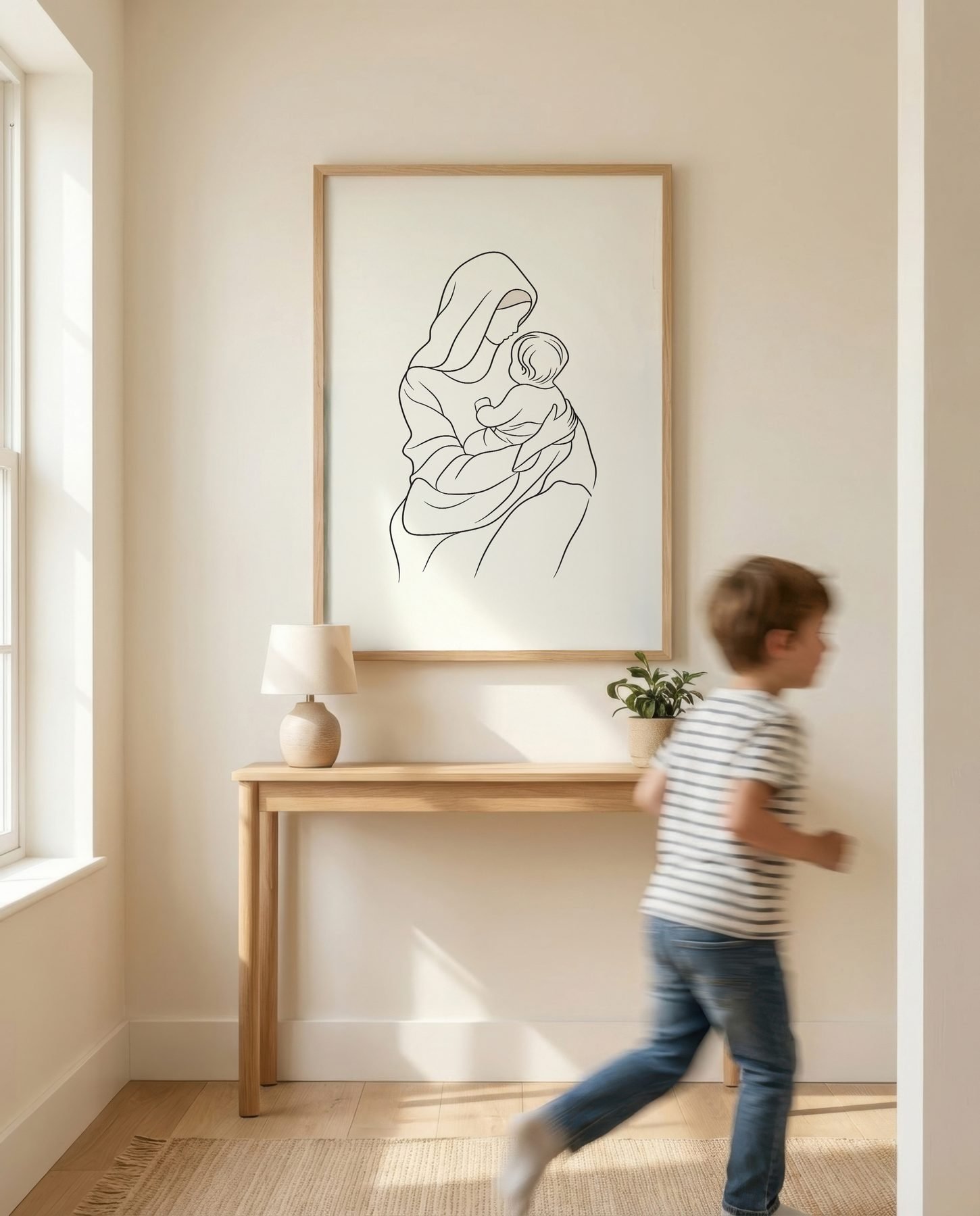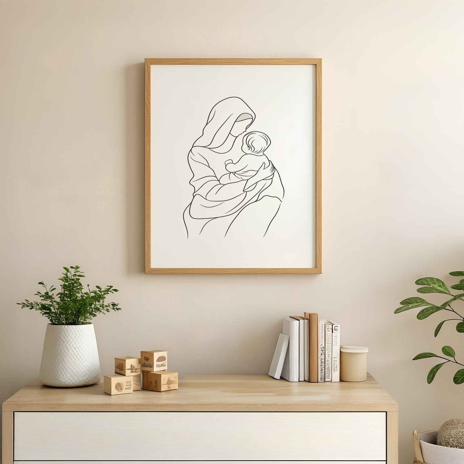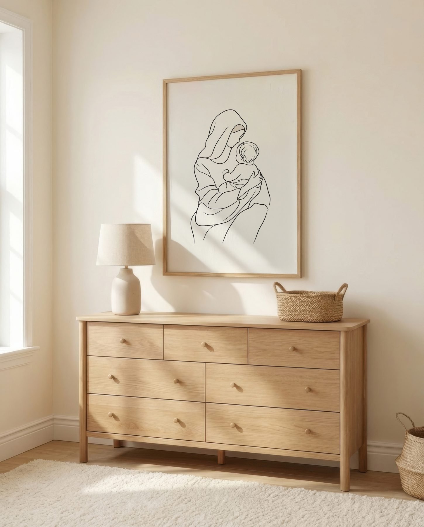 The minimalist line art approach and cream, soft beige, warm ivory palette keep it gentle in a nursery, pairing naturally with wood furniture, soft bedding, and quiet neutrals.