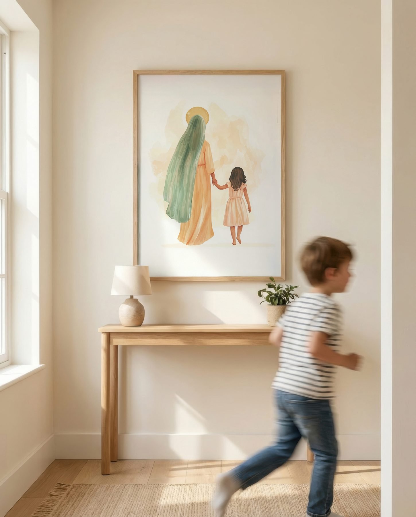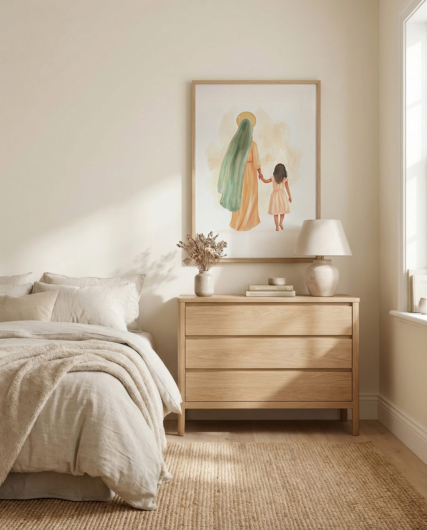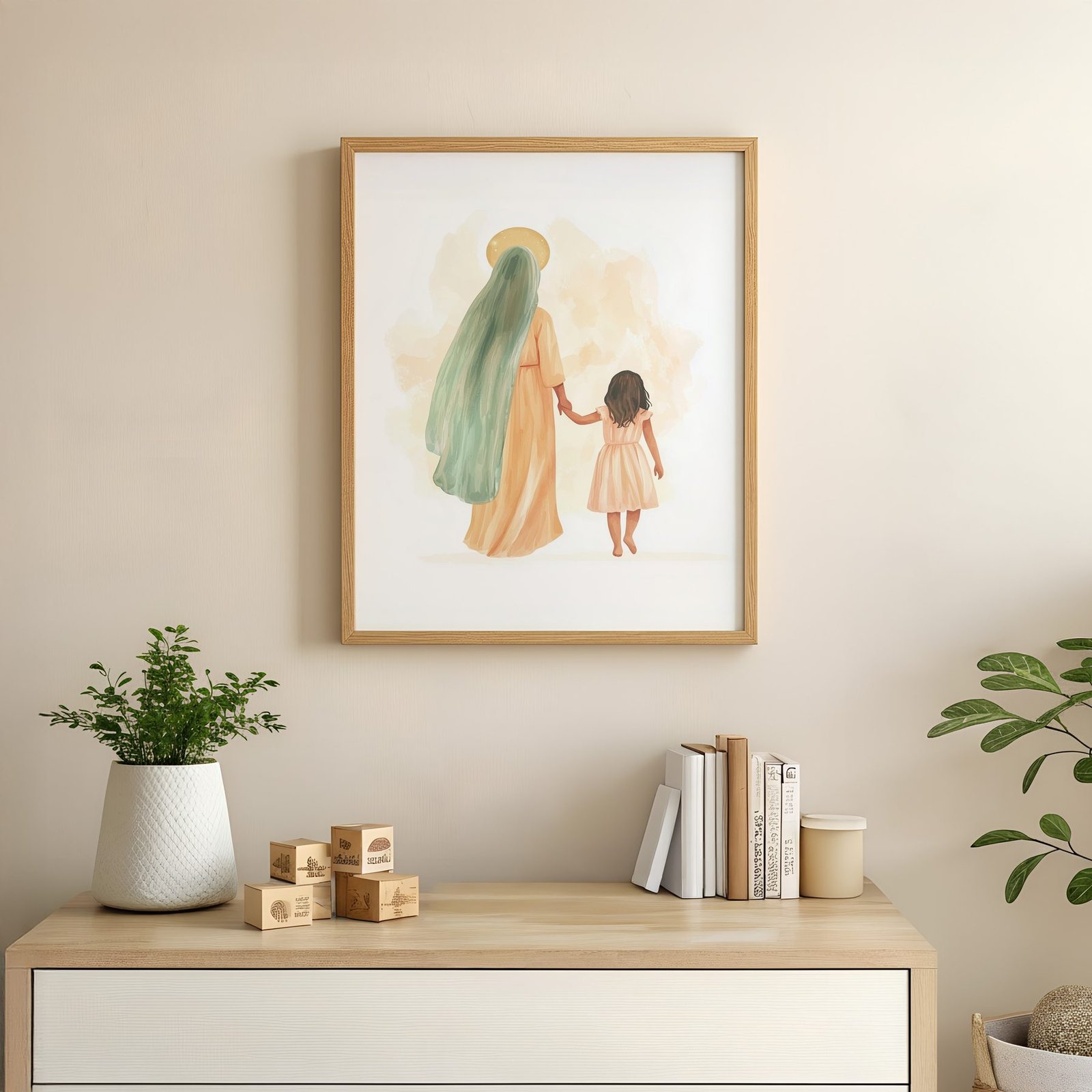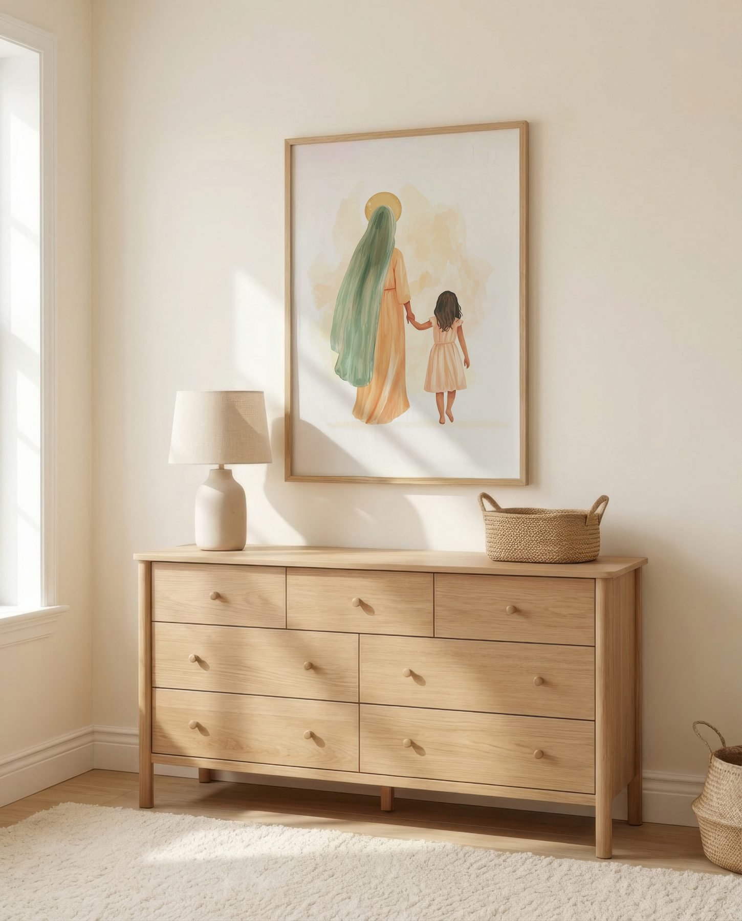 The soft watercolor illustration approach and sage green, peach, cream, golden yellow palette keep it gentle in a nursery, pairing naturally with wood furniture, soft bedding, and quiet neutrals.