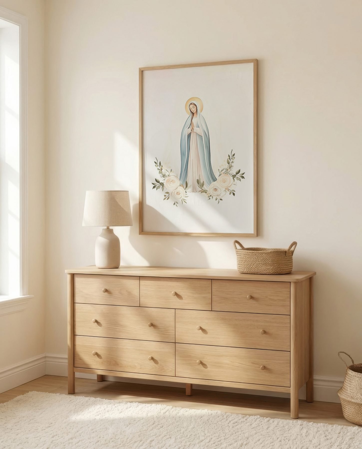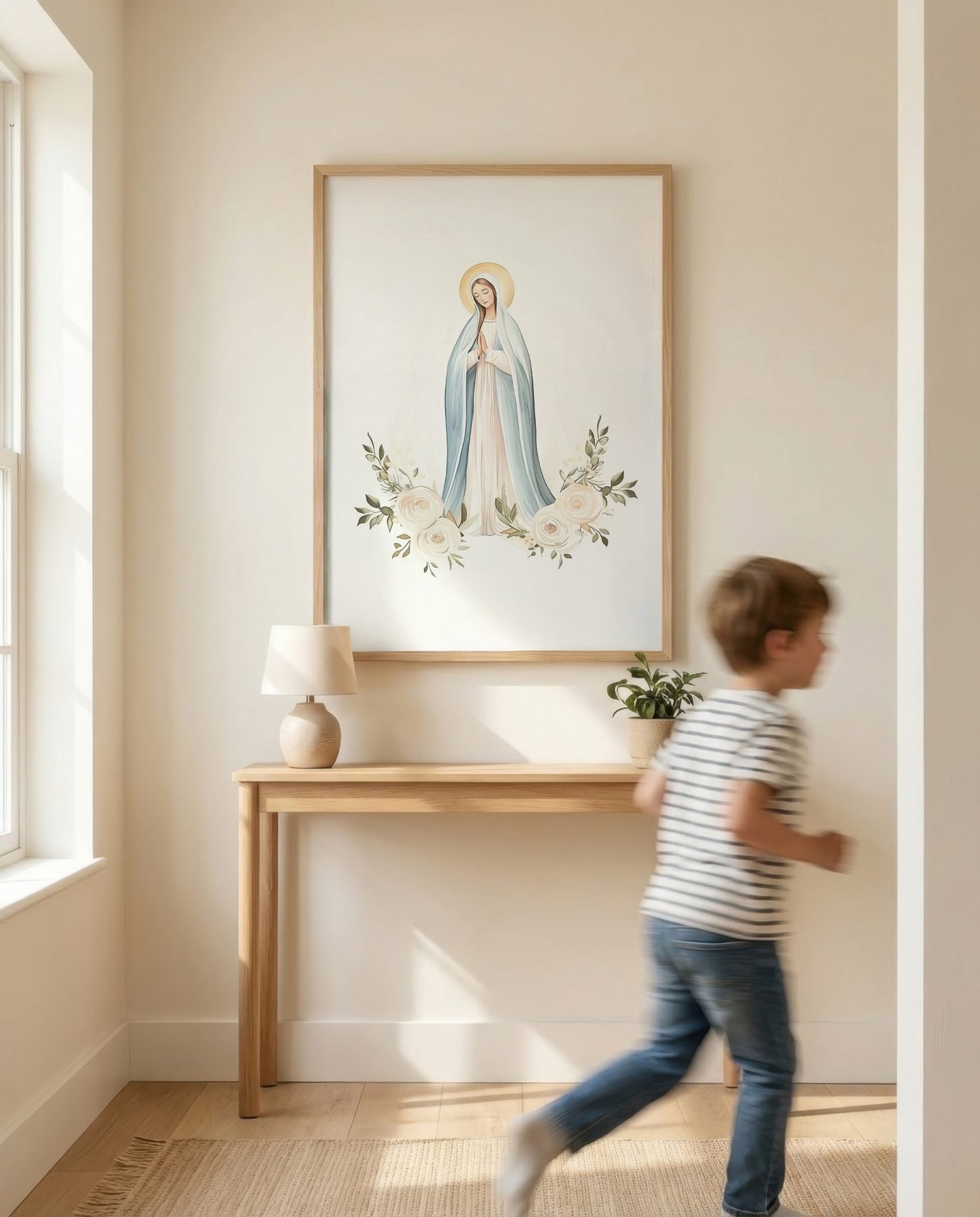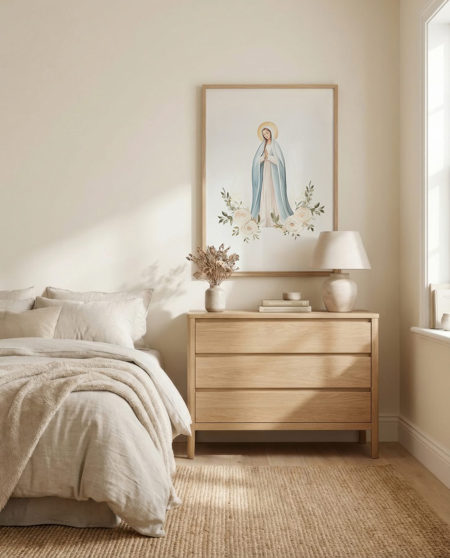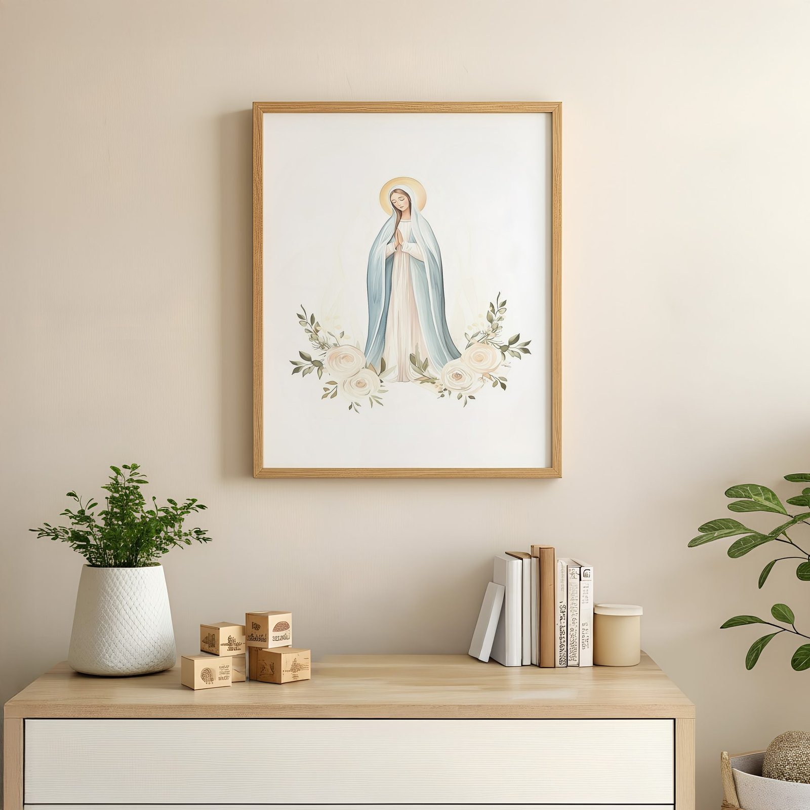 The soft watercolor illustration approach and dusty blue, cream white, soft peach, sage green palette give it presence in a prayer corner while still sitting naturally with wood, linen, and neutral walls.