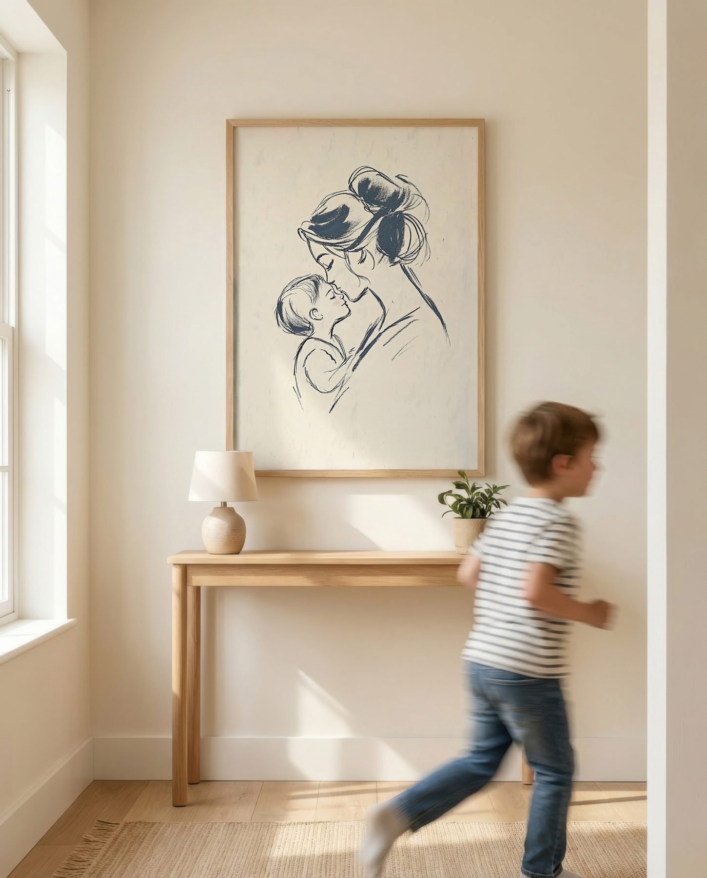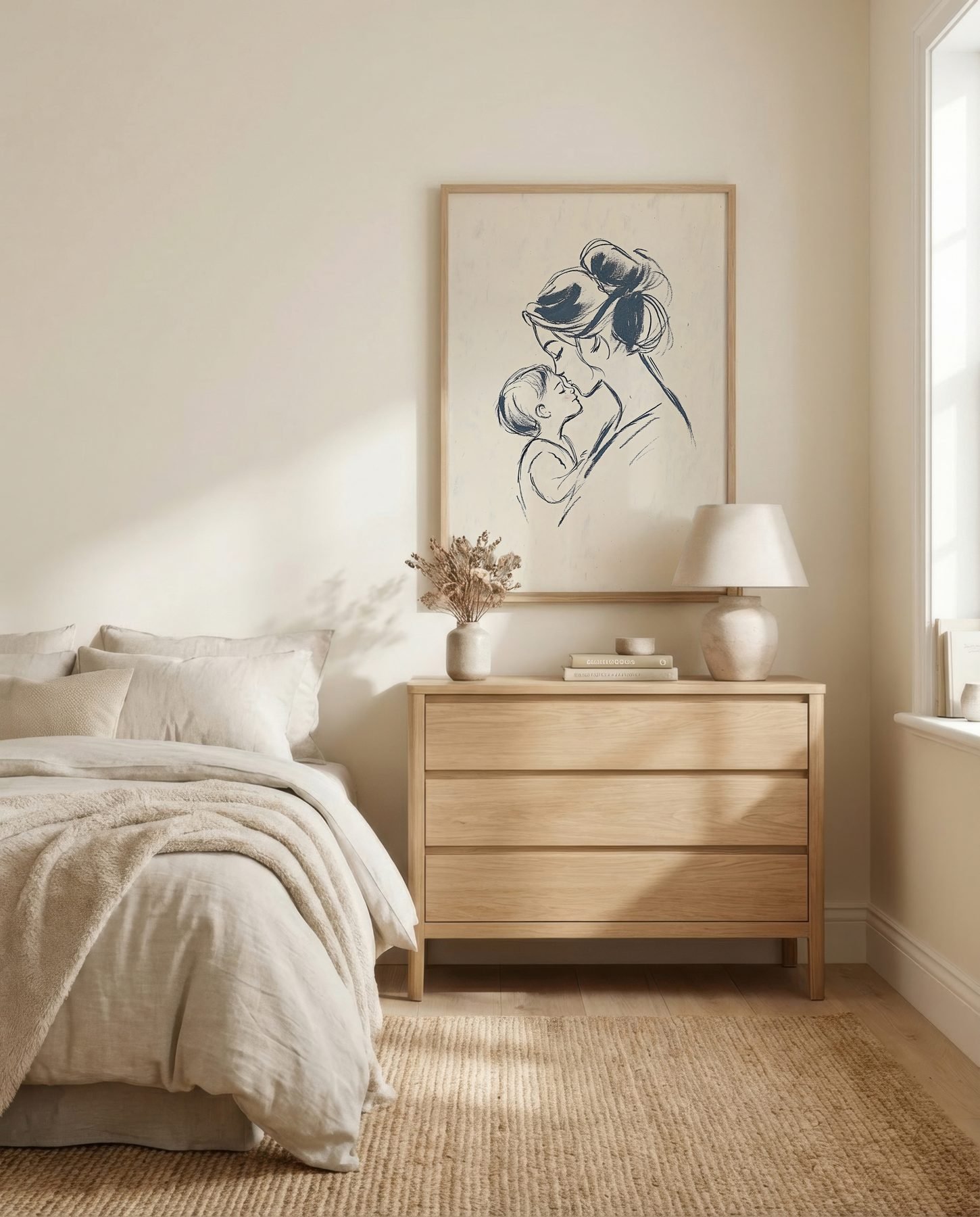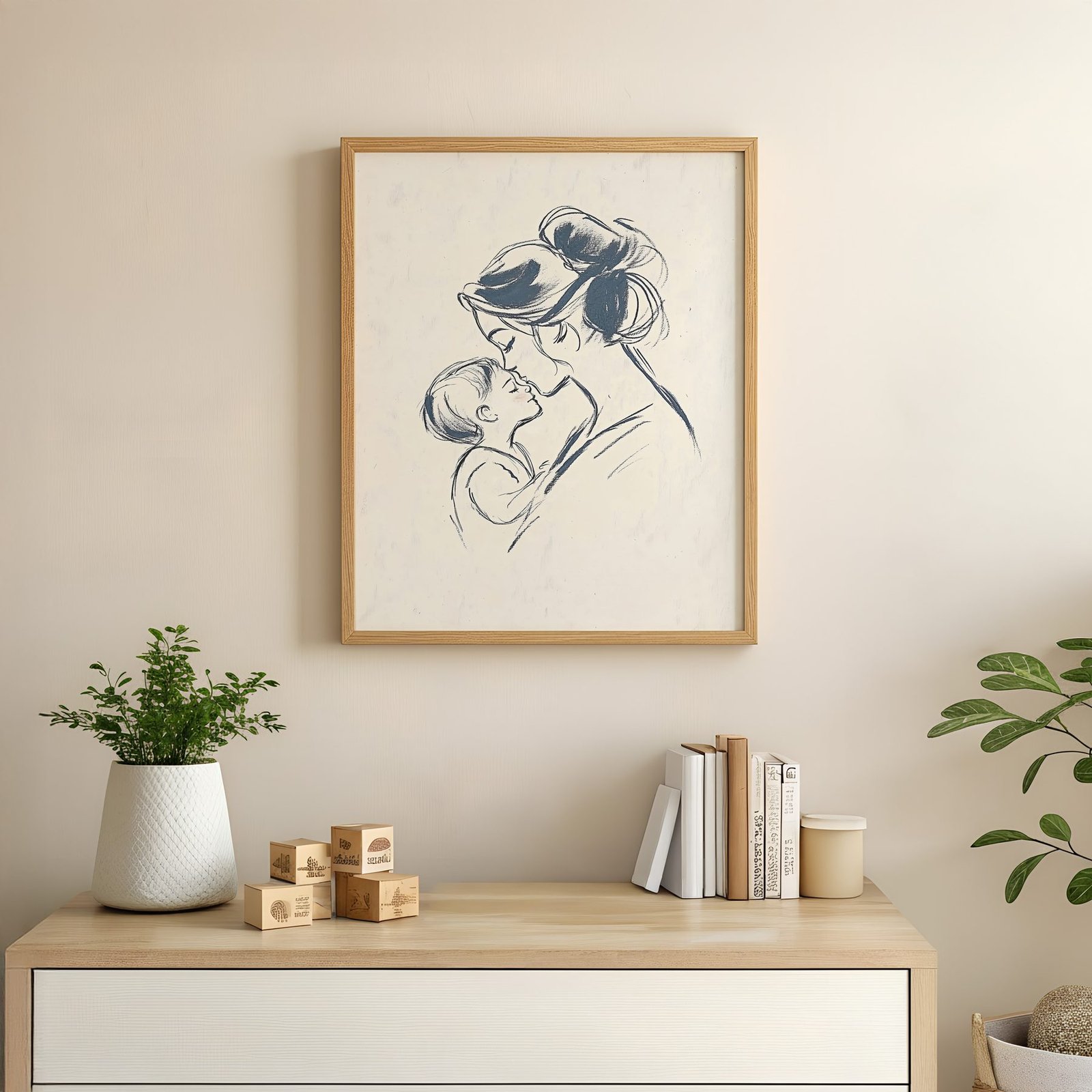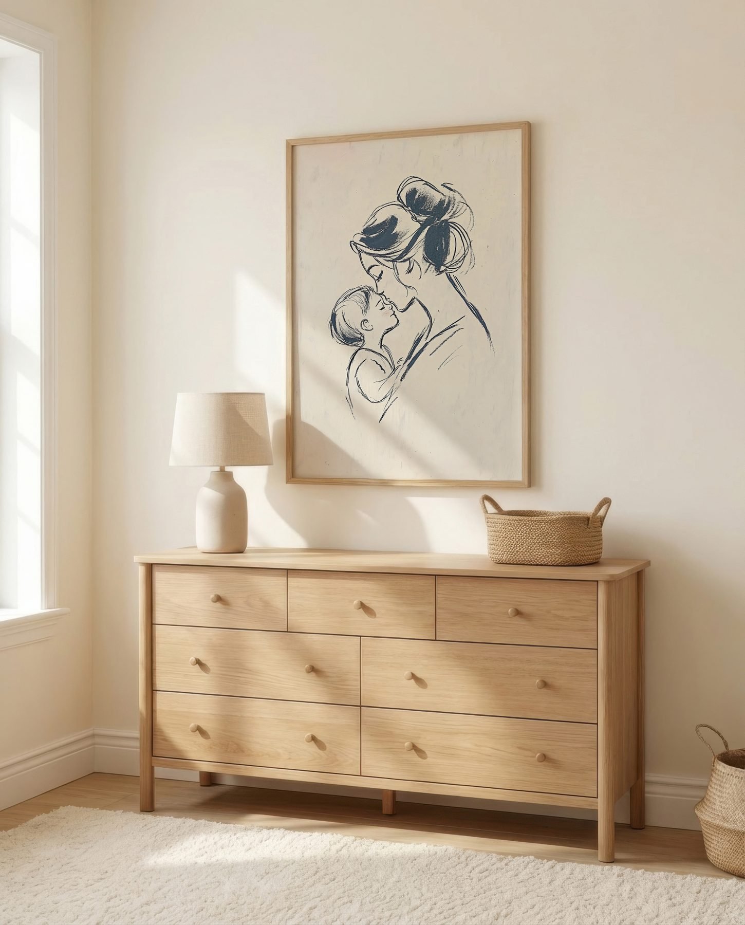 The minimalist line drawing approach and cream, charcoal gray, soft beige palette keep it gentle in a nursery, pairing naturally with wood furniture, soft bedding, and quiet neutrals.