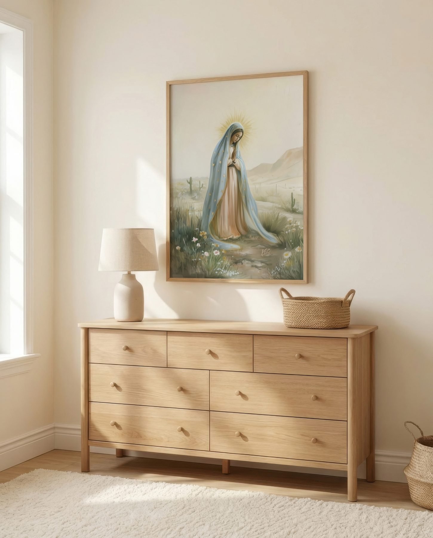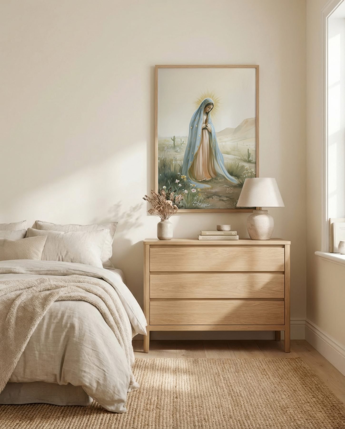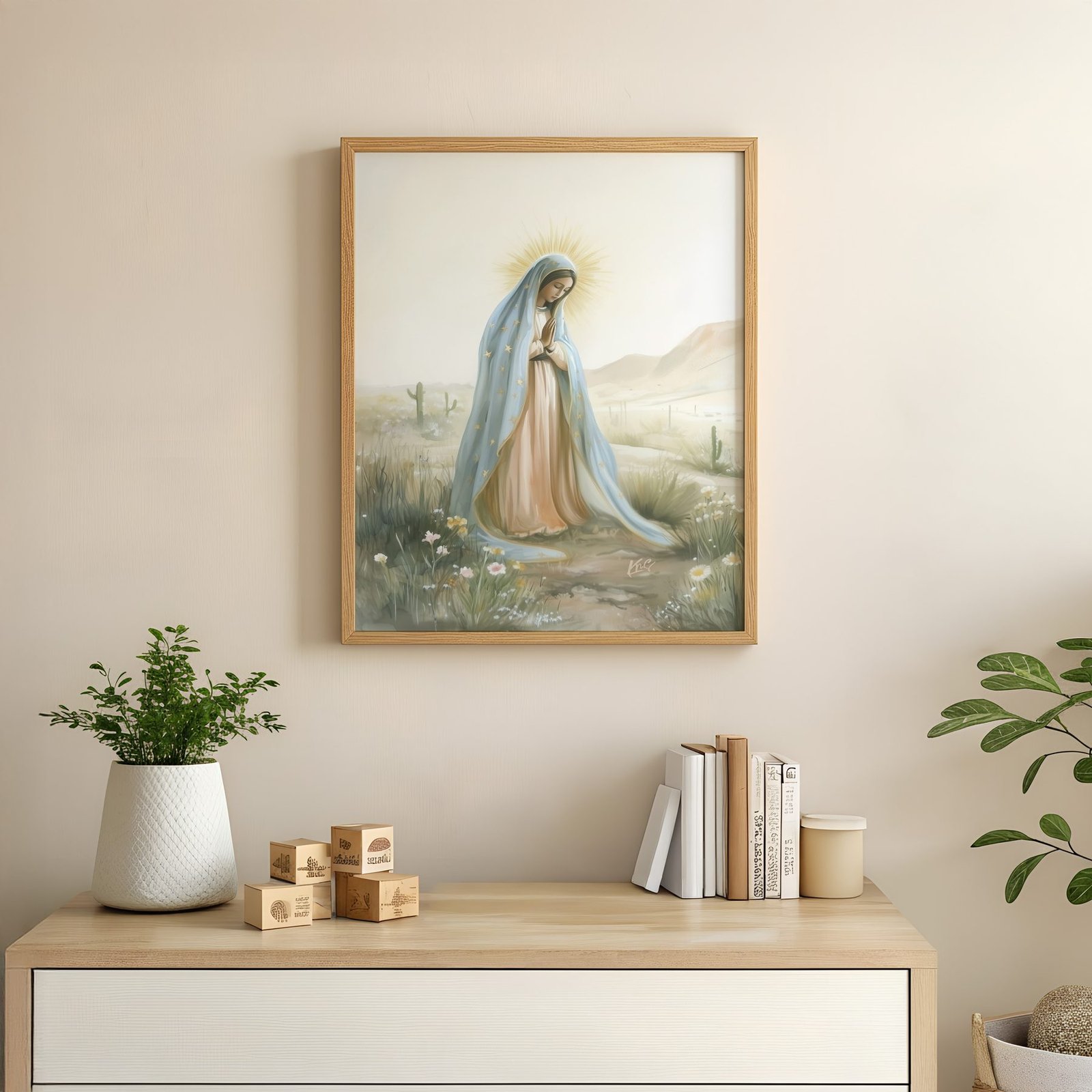 The soft ethereal illustration approach and sky blue, cream, golden yellow, sage green, dusty rose palette give it presence in a prayer corner while still sitting naturally with wood, linen, and neutral walls.