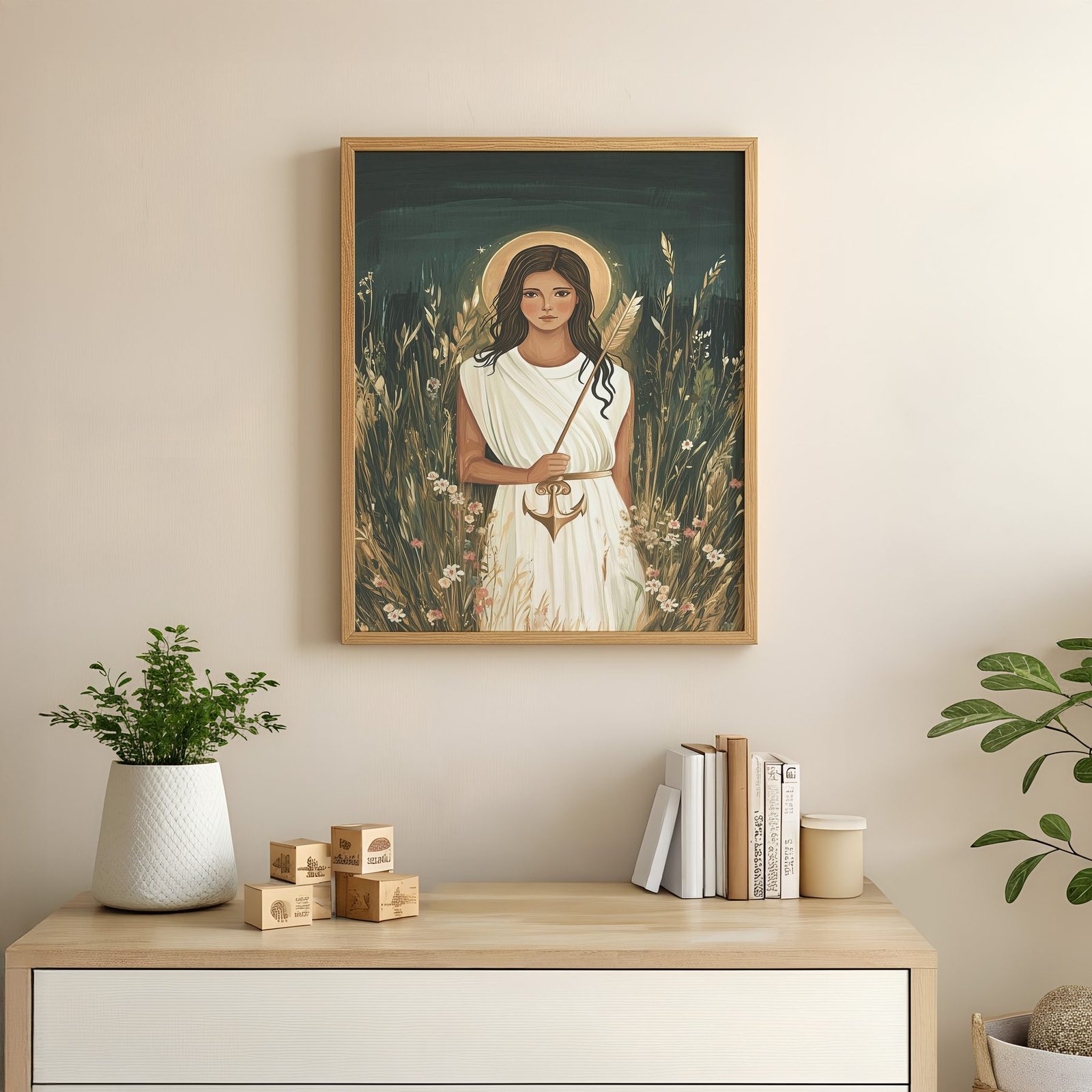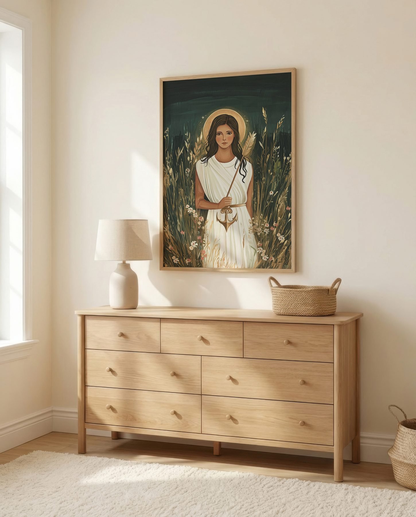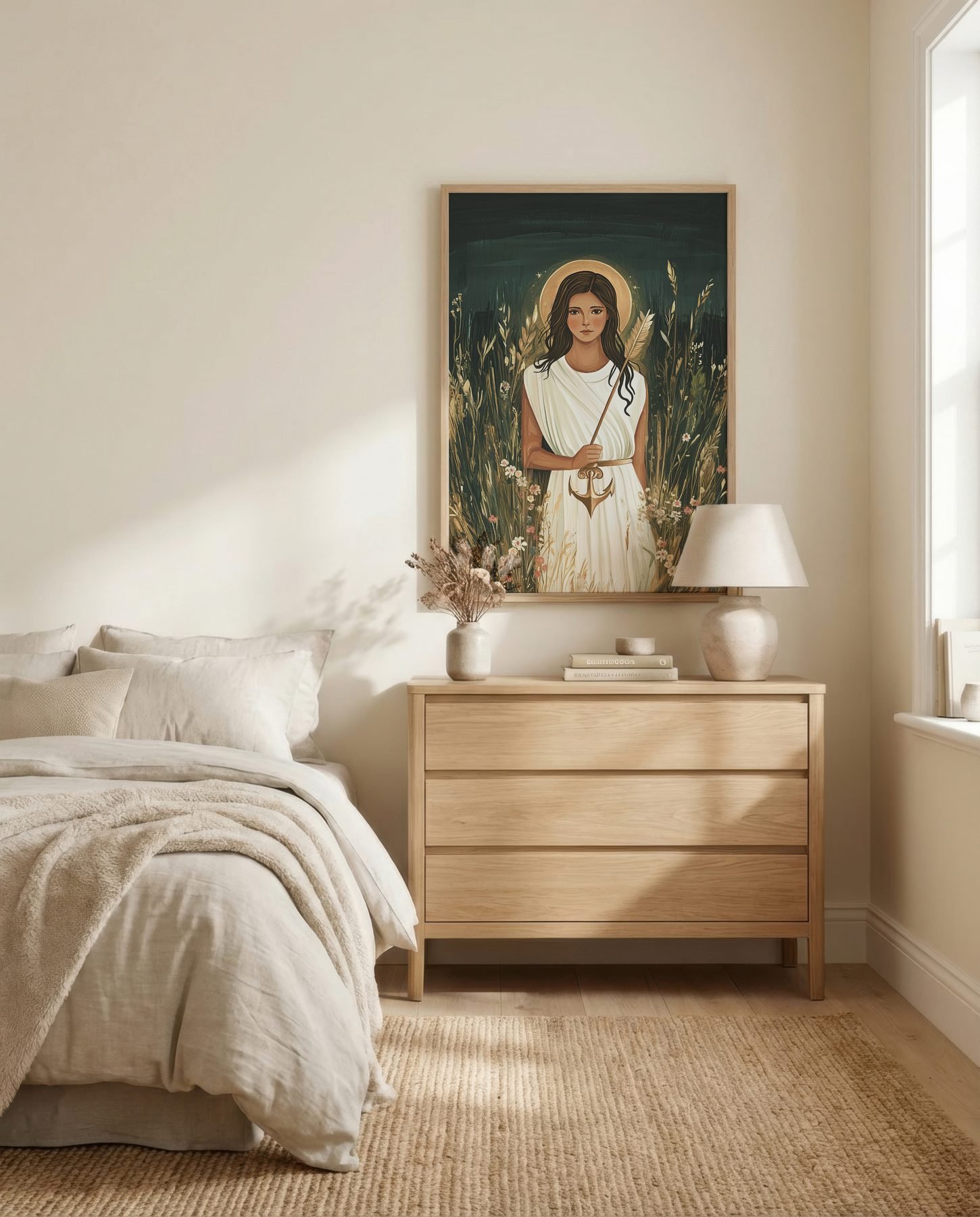 The painterly folk art approach and sage green, cream white, golden yellow, warm brown palette give it presence in a prayer corner while still sitting naturally with wood, linen, and neutral walls.